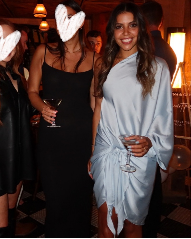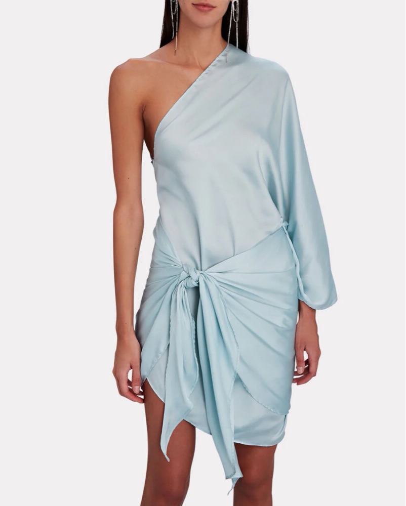 Baobab Cabana one-shoulder satin mini dress in soft blue with draped knot detail. Perfect for weddings, birthdays, cocktail parties, or vacation dinners. In excellent condition.