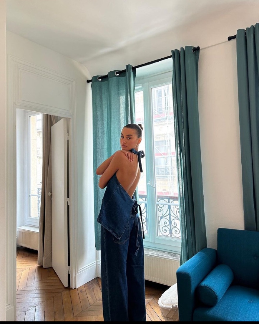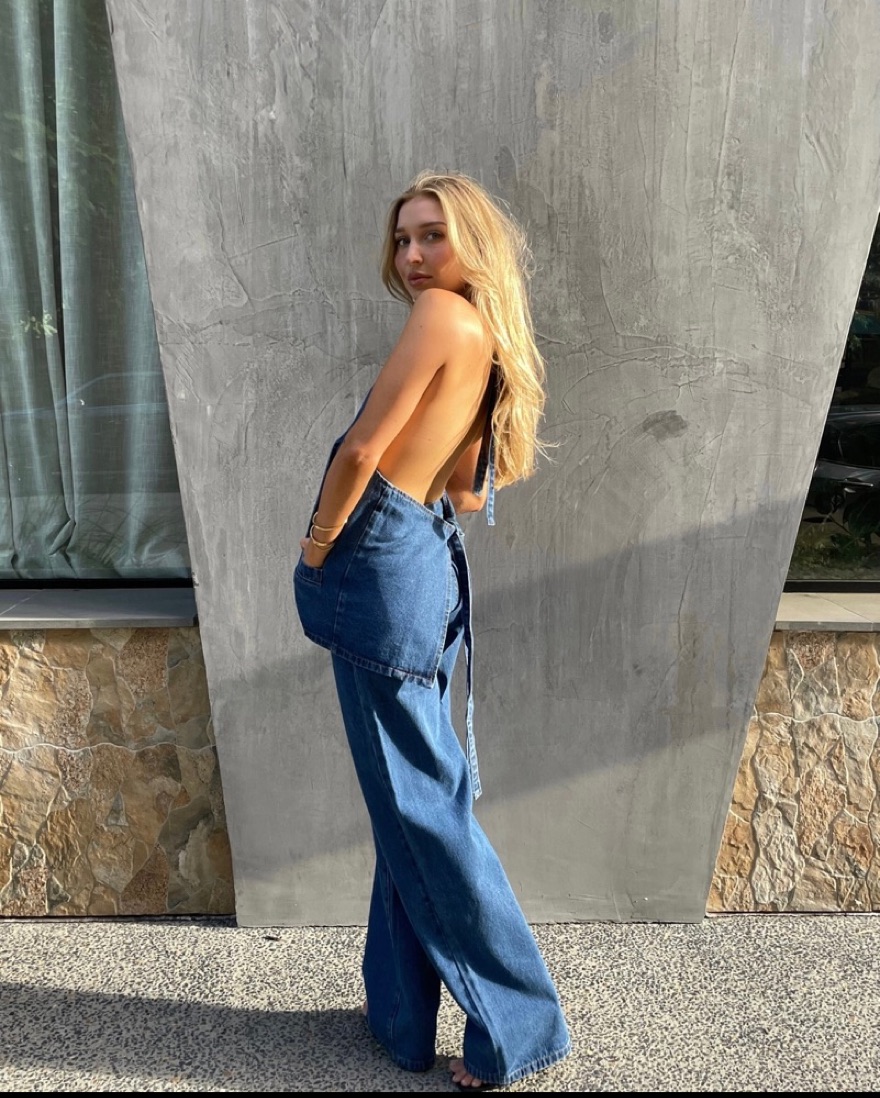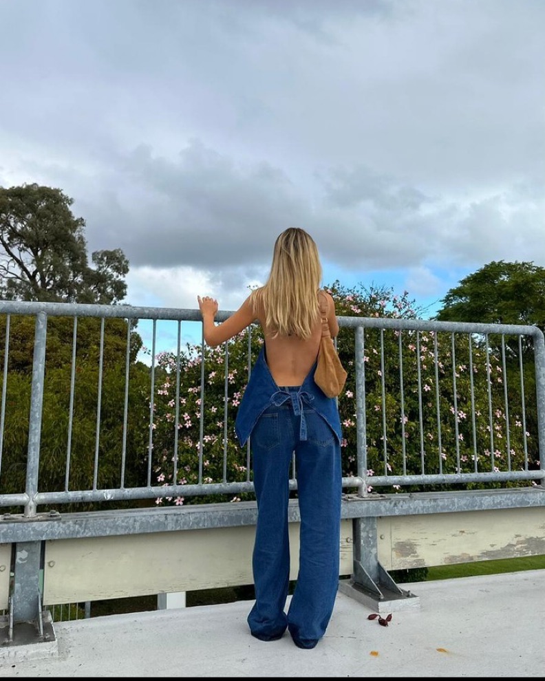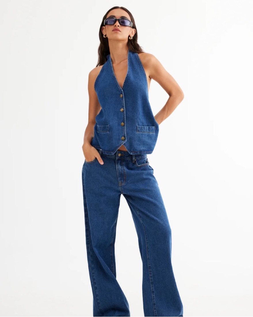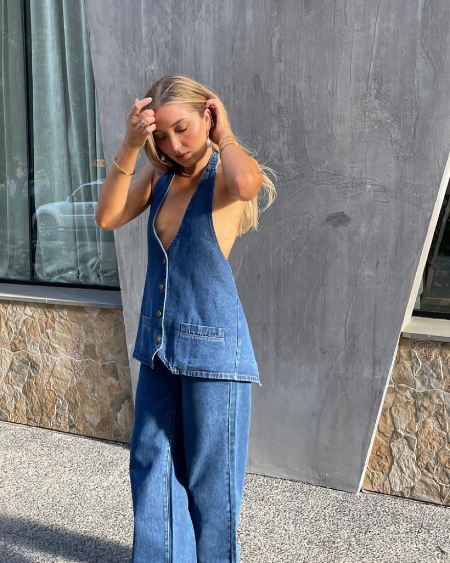 Top model jeans and hills halter from lioness in dark denim. Full length straight jeans and open back tie halter top. Such a fun set! Please do not wash. Very small hole in hem of pants from wear. Not noticable when worn.