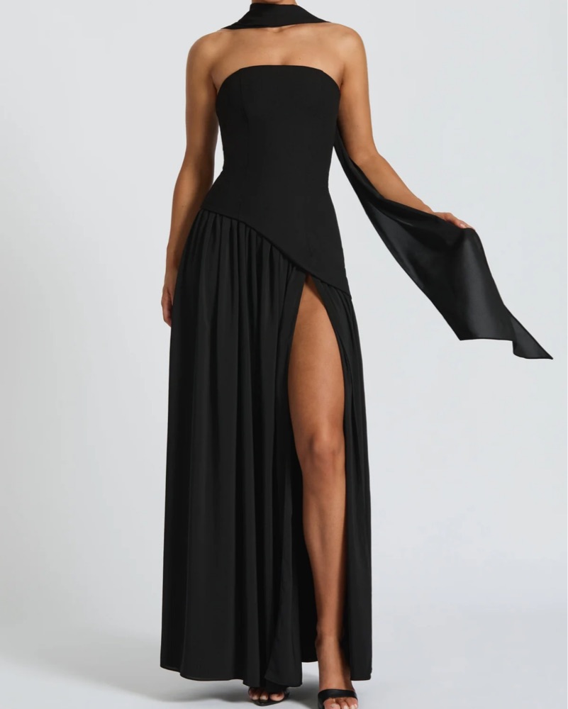 Colour: Black. Non-stretch crepe bodice. Scarf included. Chiffon skirt & scarf. Fully lined. Princess seams on bodice. Asymmetrical hem on bodice. Full, gathered skirt. Thigh high split. Invisible zipper closure.