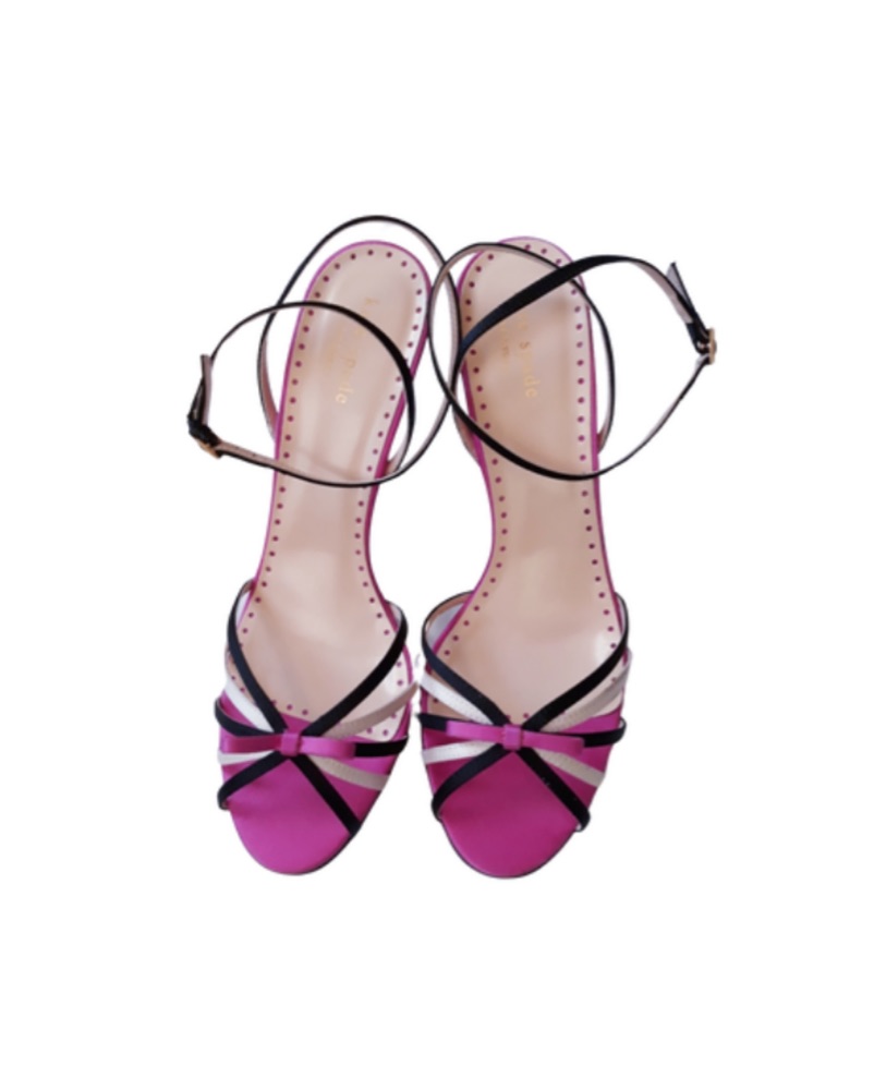 Adorable Kate Spade strappy open toe bow heels. Fuschia, white and black with black heel and ankle strap closure. Like new! US 8.5-9.