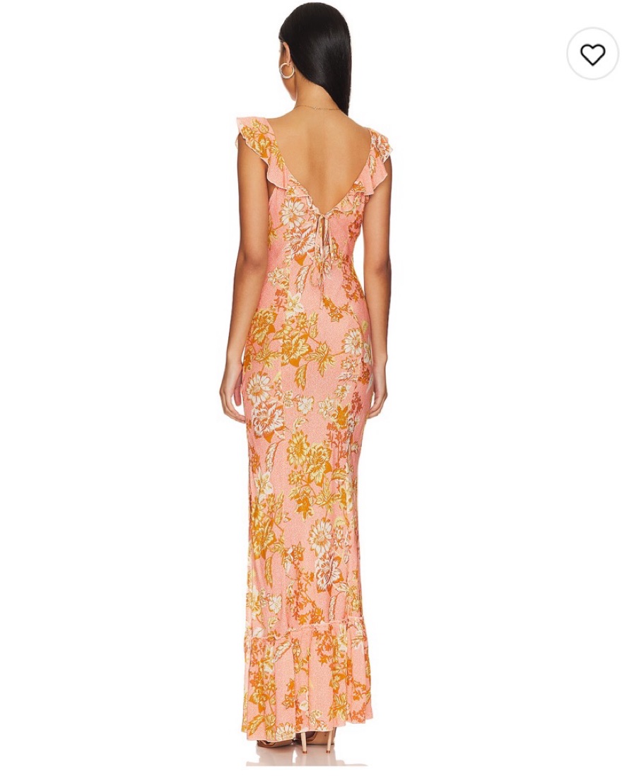 Super pretty & flowy floral long maxi dress perfect for summer! Light pink / peach color with yellow & orange flower details. Size is XS but runs a little larger - I am a S and this firs me well :)