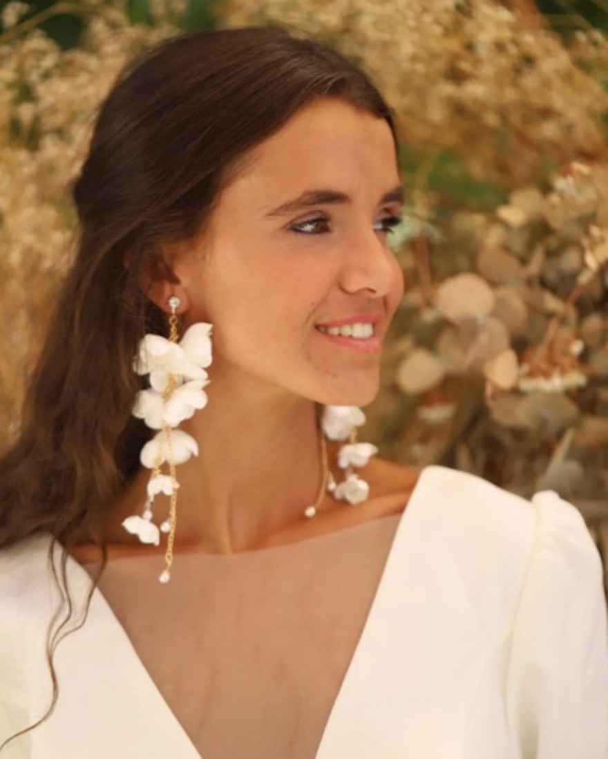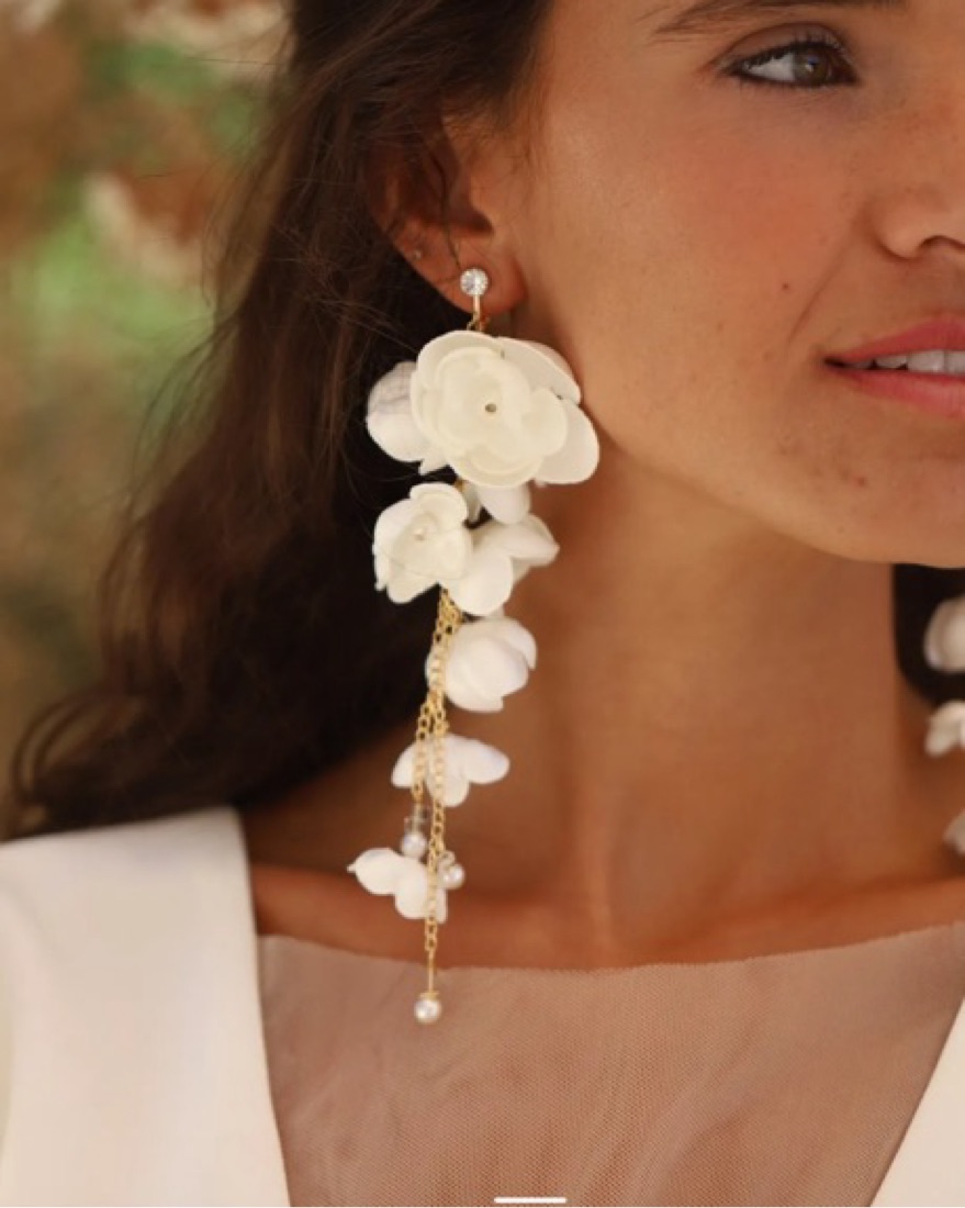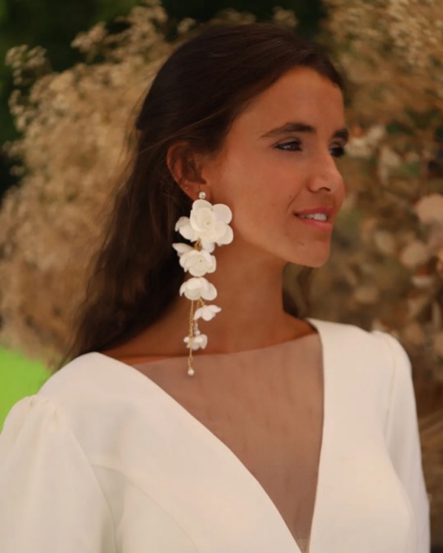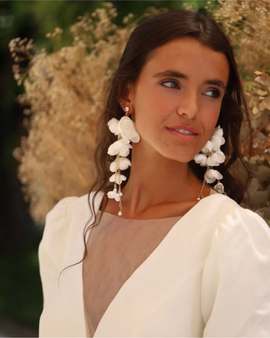From Luxury Bridal Designs in Spain. 3D fabric flowers are an impressive and unique accessory that will add a touch of femininity and elegance to any outfit. Gorgeous white flower extra long bohemian wedding earrings. Very versatile and beautiful bridal earrings in a unique design made with love.