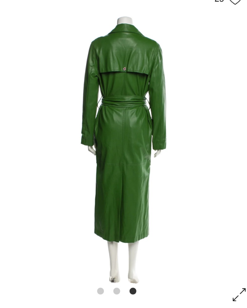 Staud Faux Leather Trench Coat Green Pointed Collar Long Flap Pockets & Button Closure