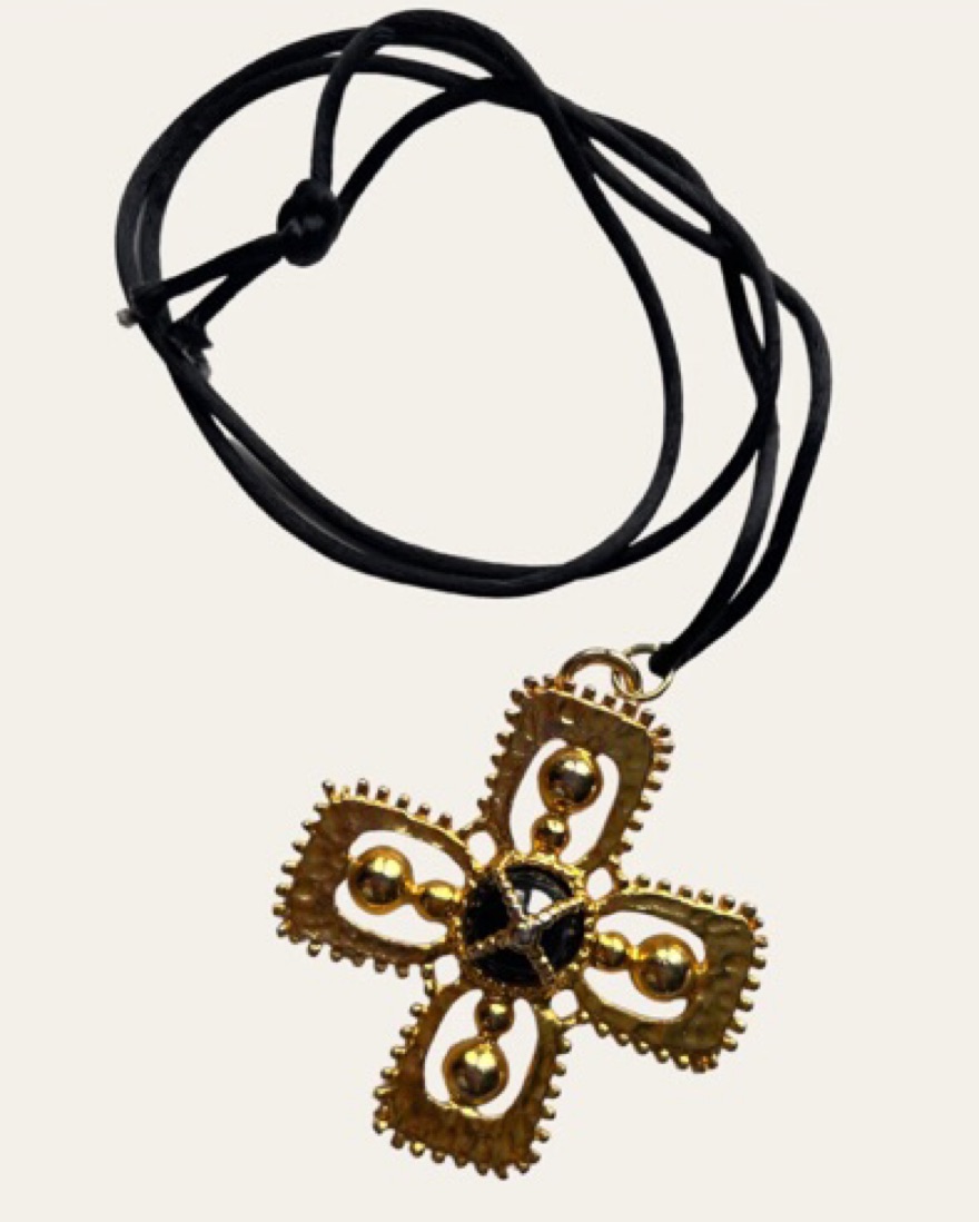 Vintage brass and glass bead pendant necklace from the 90s. Shiny black string can be tied to adjust the length. So unique and beautiful.