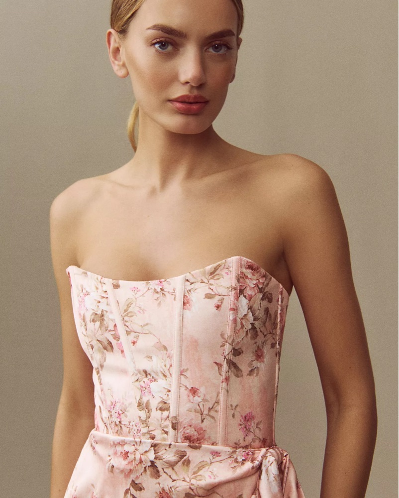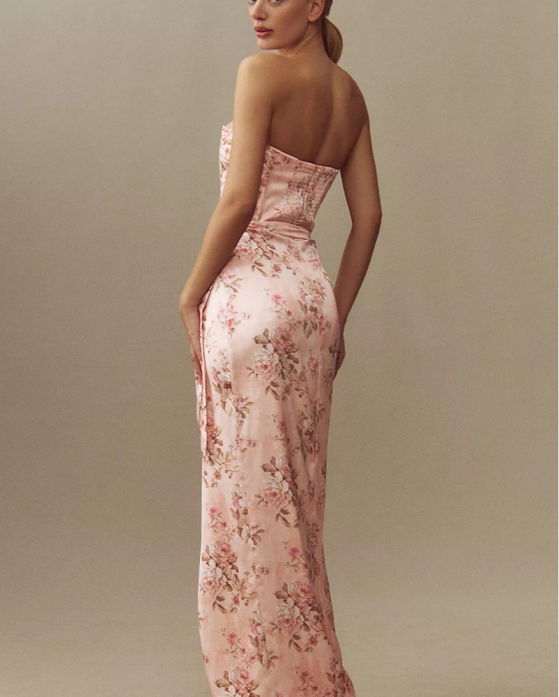 June Printed Corset Front-Slit Satin Gown in Peach Tapestry