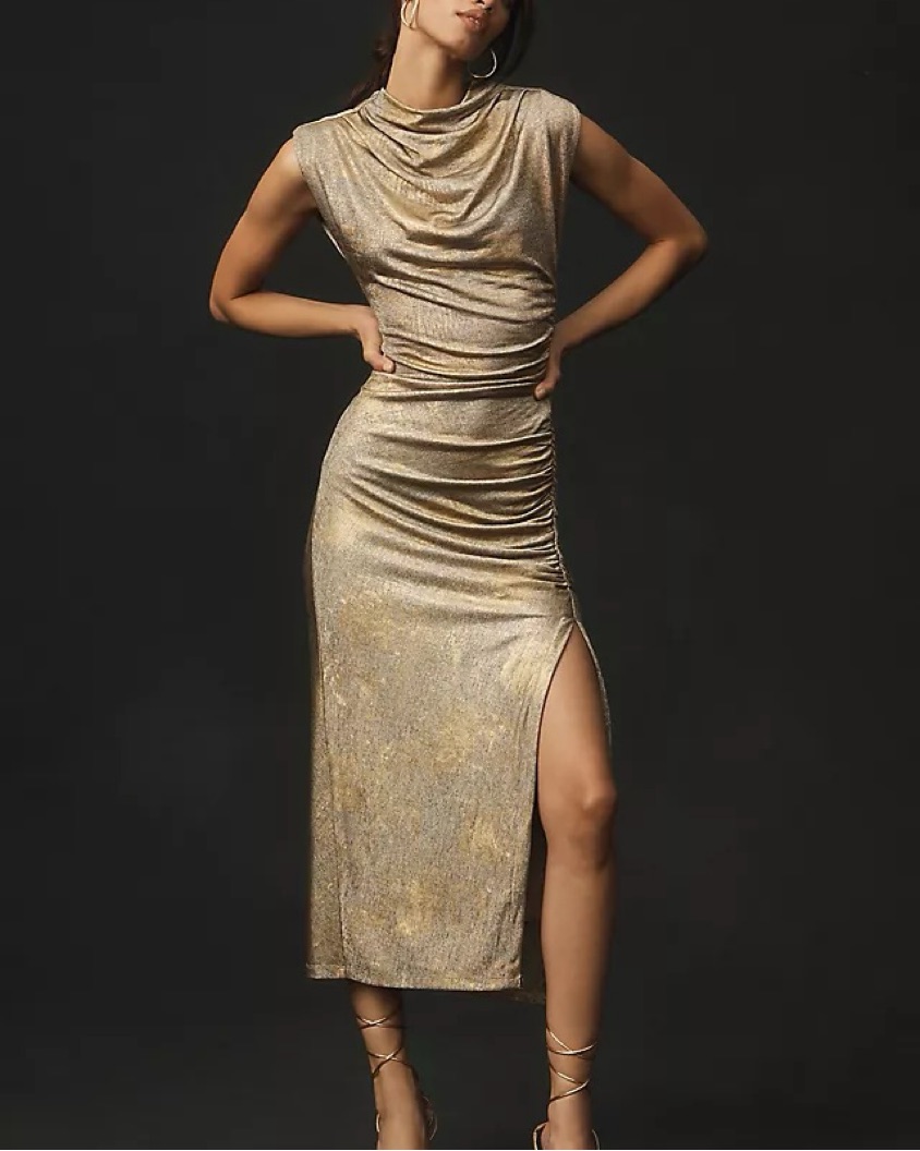 This dress from Anthropologie is one of my favorite designs. The cowl neck dress is so flattering. This one specifically is the Shine Edition. You can see me wearing it in the last photo.