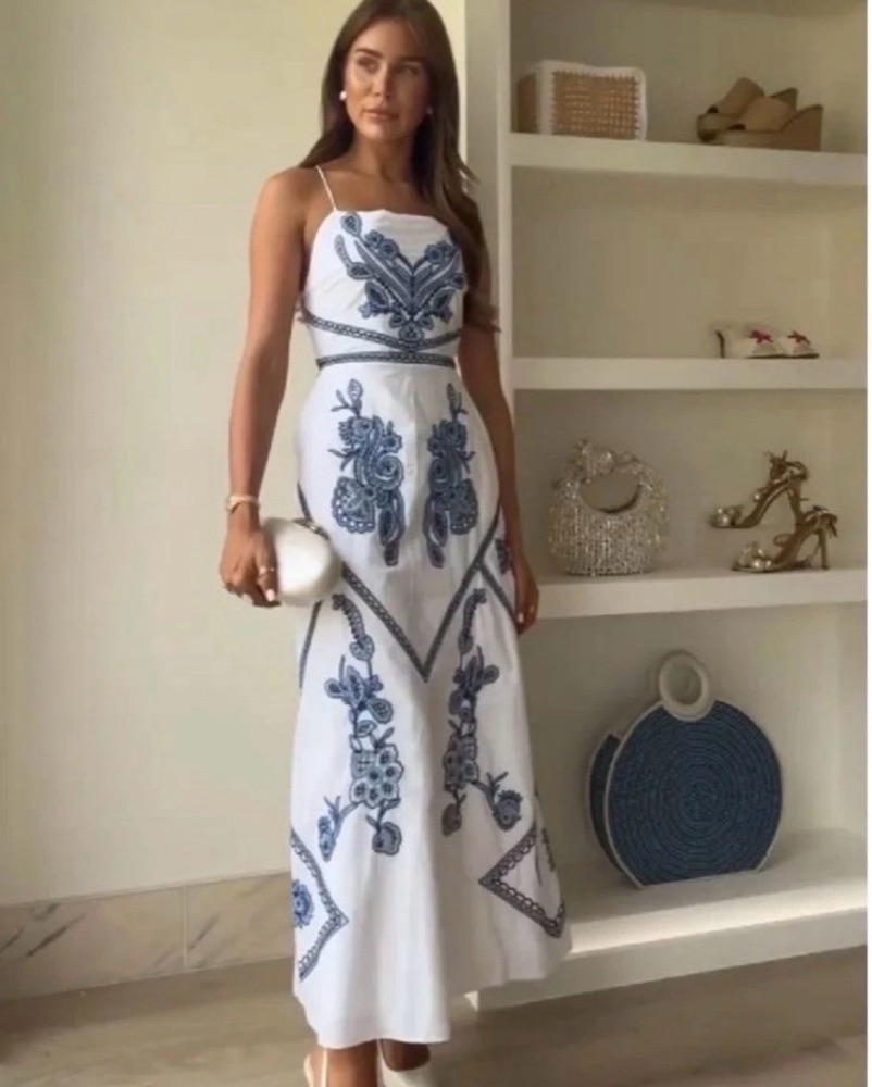 This stunning maxi dress is perfect for a summer evening out. The intricate blue and white floral print and sleek silhouette create a chic, sophisticated look that is sure to turn heads.