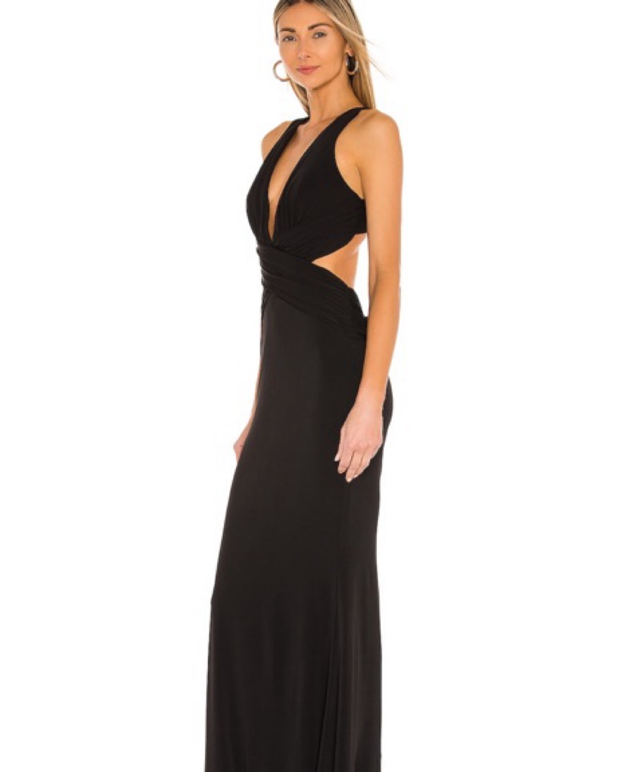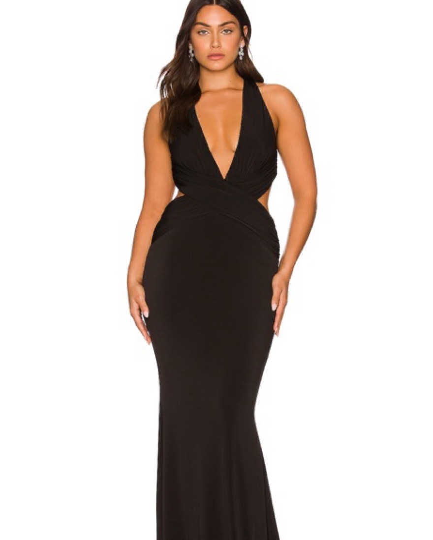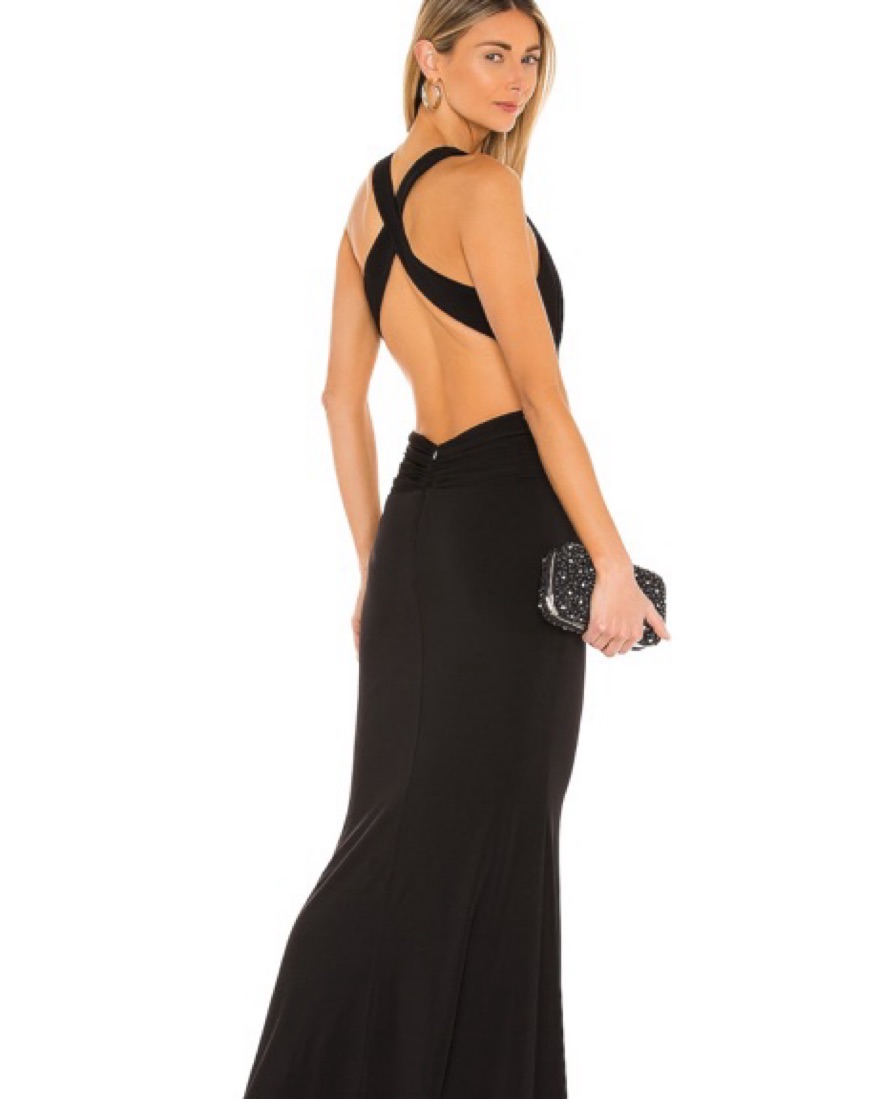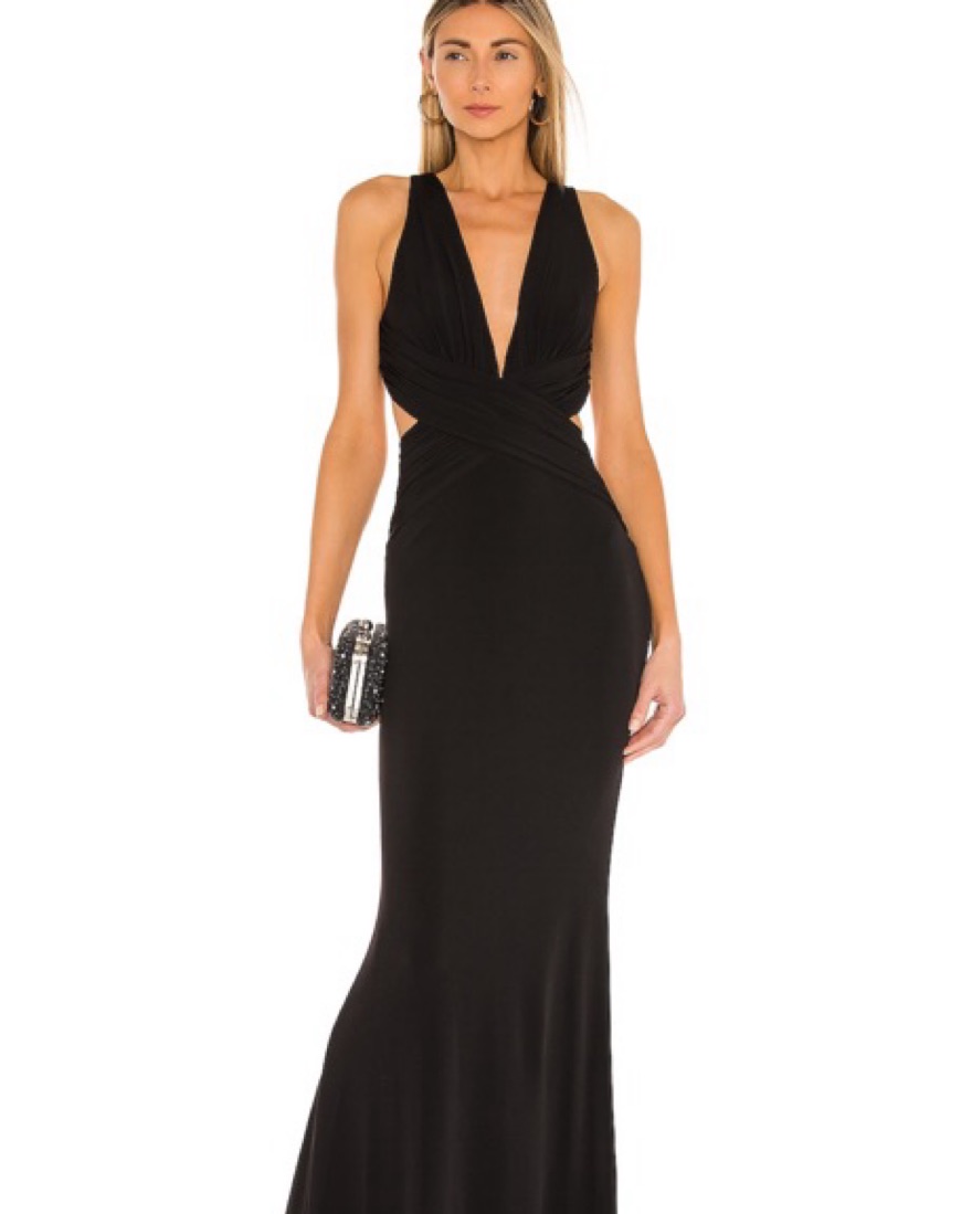 This dramatic black gown is perfect for a formal event, wedding or special occasion. Worn once to a wedding.