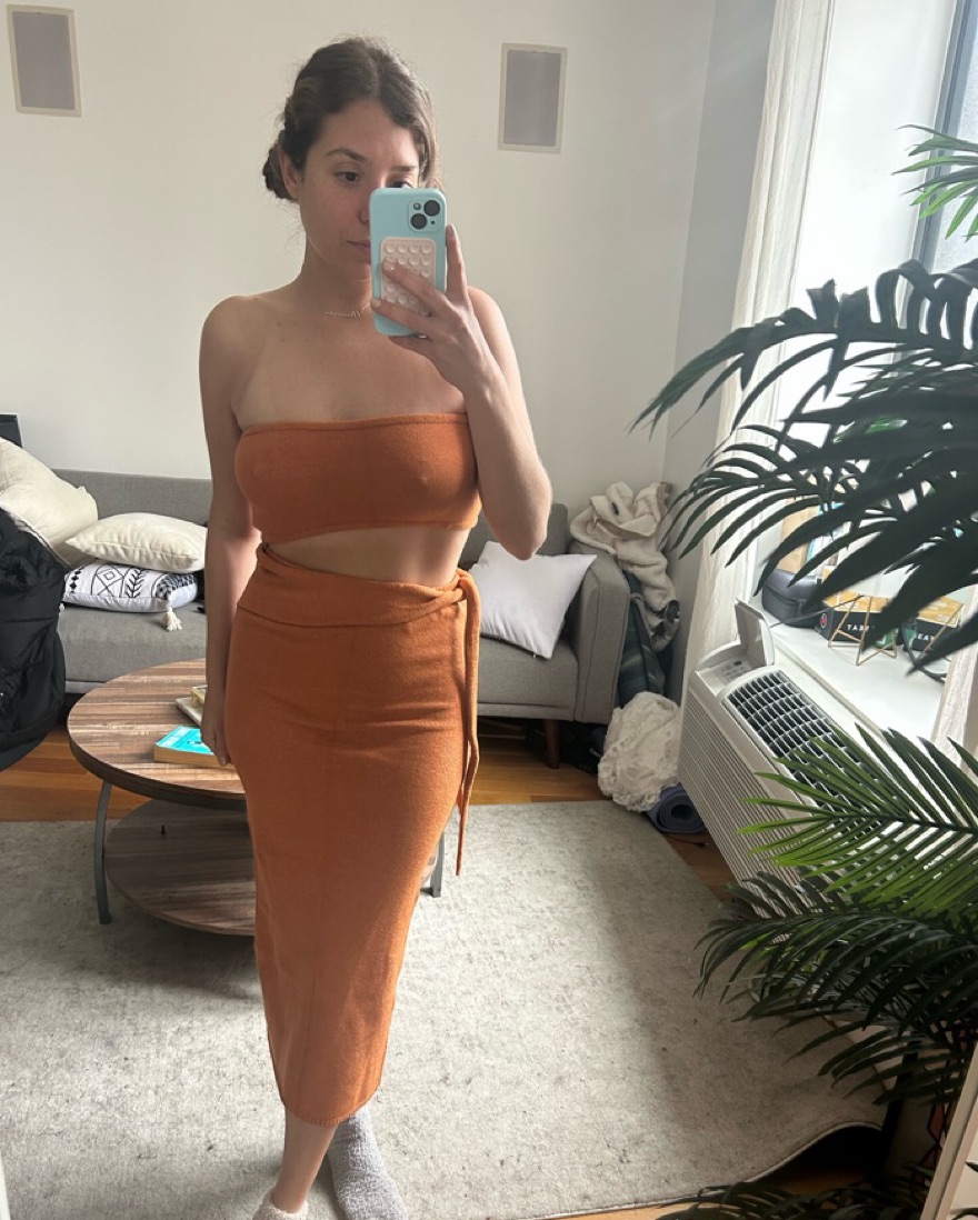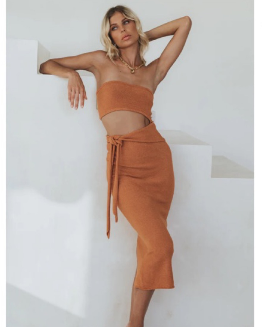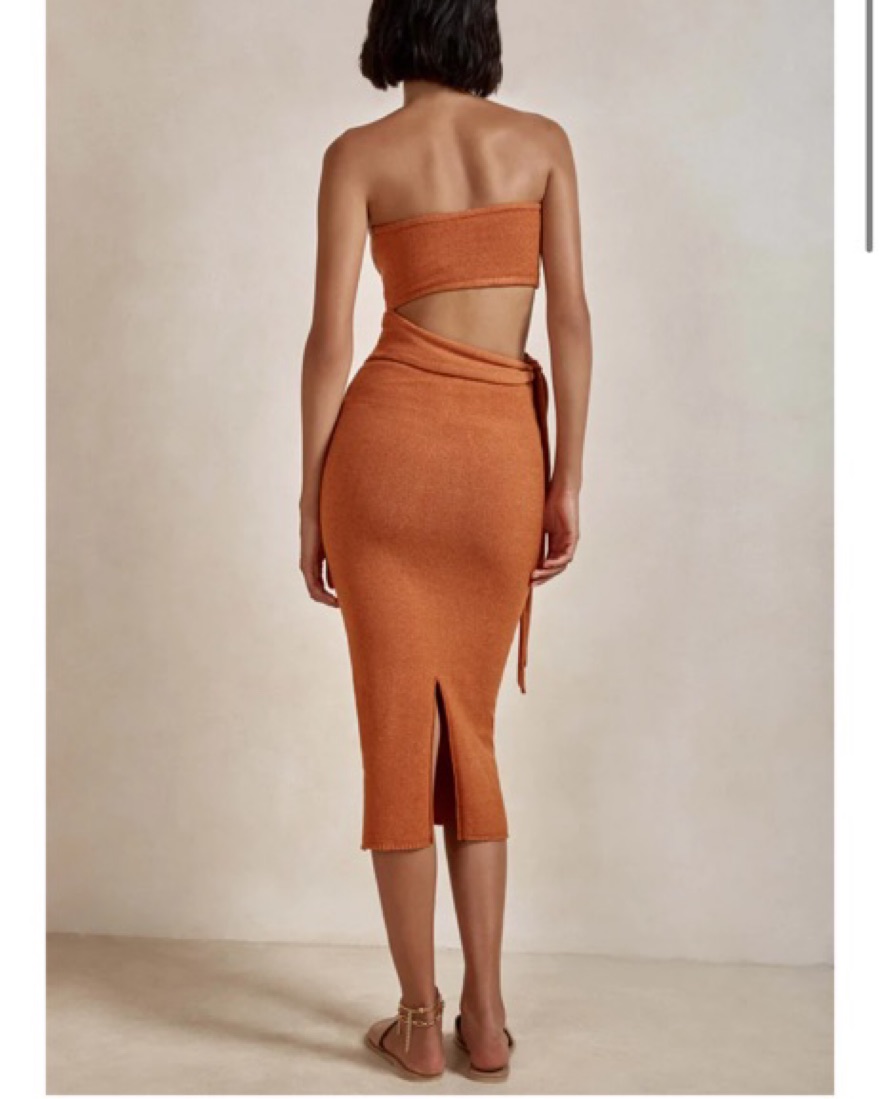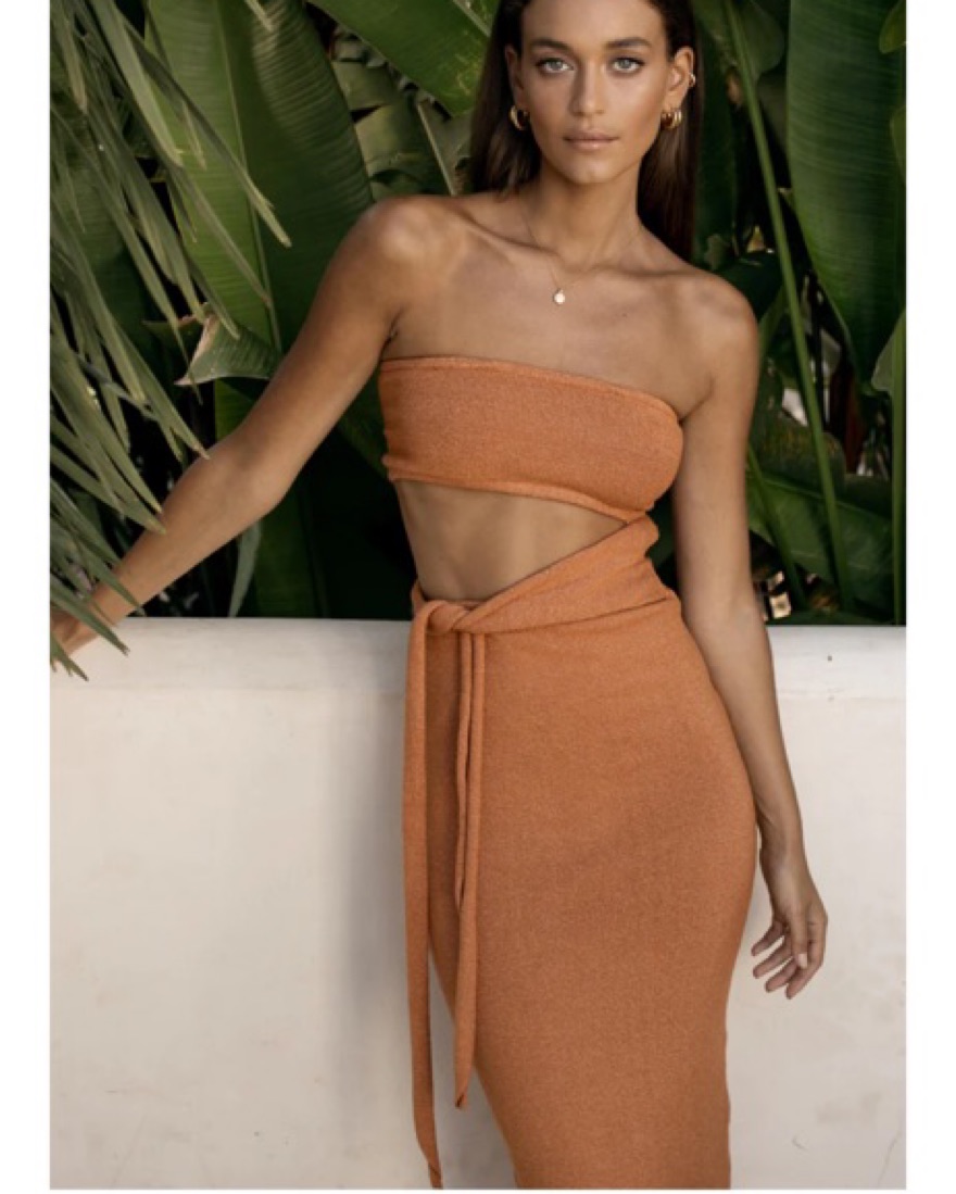 Easy dress for tropical vacations. Can wear during the day or night, color is a burnt orange / copper. Soft fabric has a ton of stretch. Runs true to size.