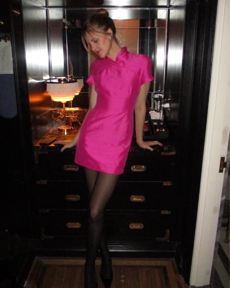 Adorable pink mini dress with Mondrian collar, shiny pink material. Would be amazing for a night out or a pop of color on nye.