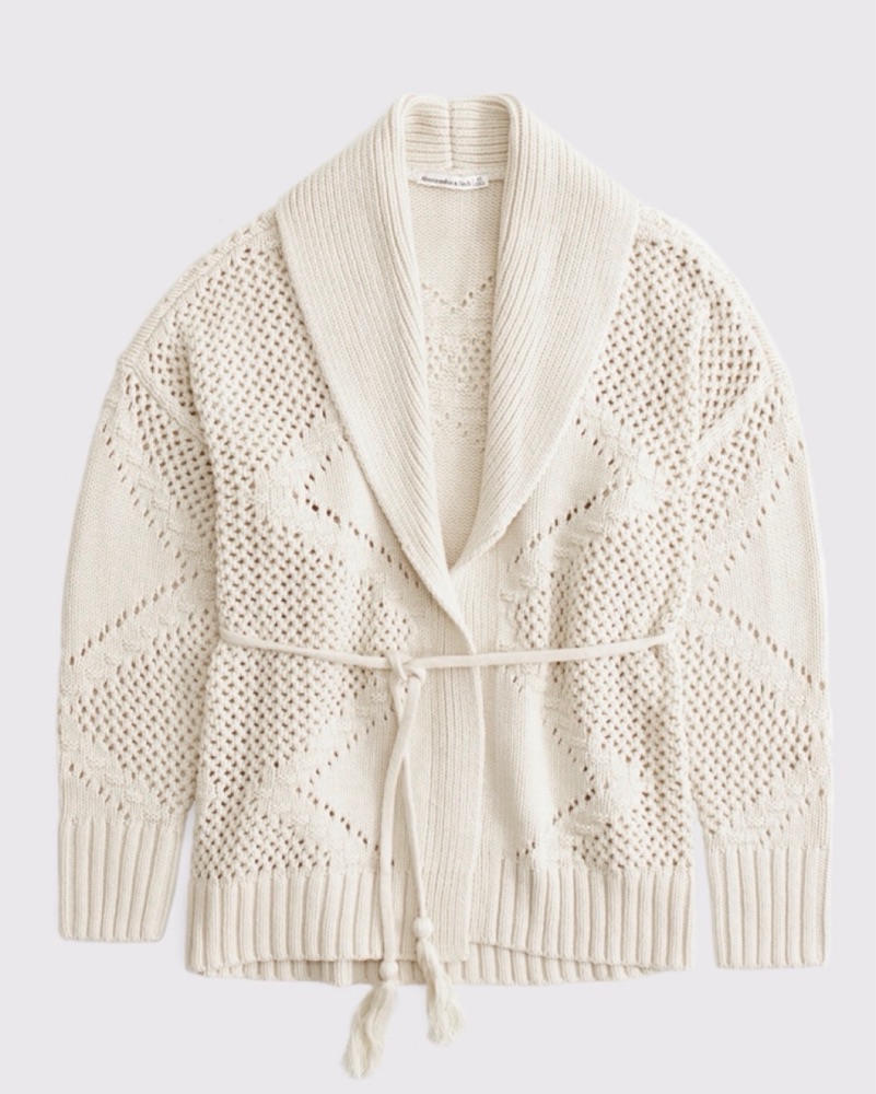 Beige cardigan in soft sweater yarn fabric. Features a shawl collar, adjustable belt around the waist, textural stitching details throughout and rib trims at the cuffs and hem.