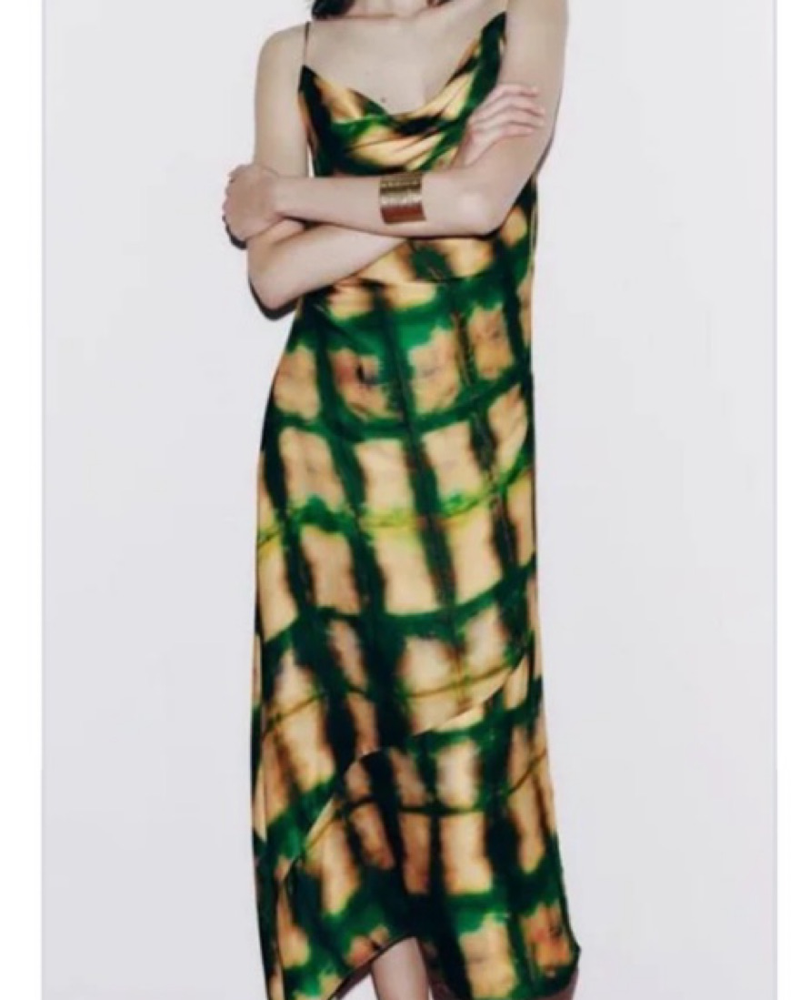 Zara Green Gold Tie Dye Slip Satin Dress | key words: slip dress long vacation emerland green yellow snake