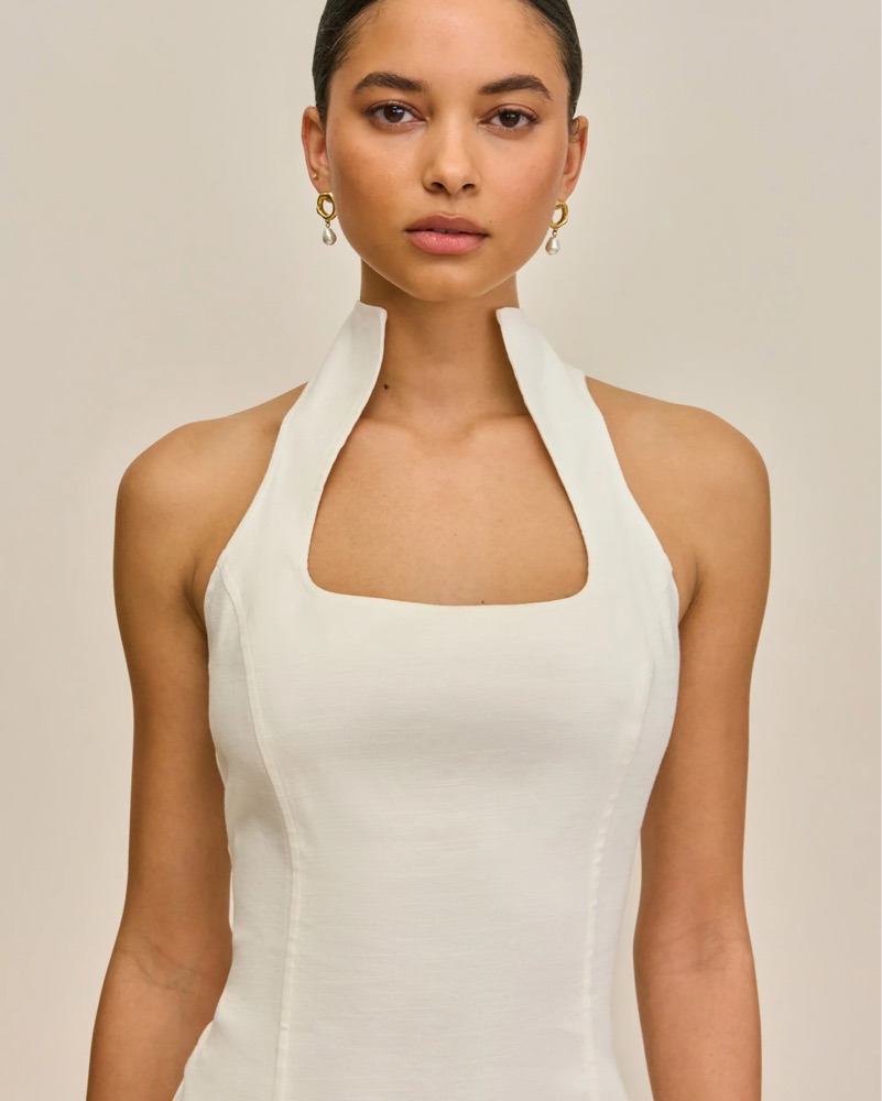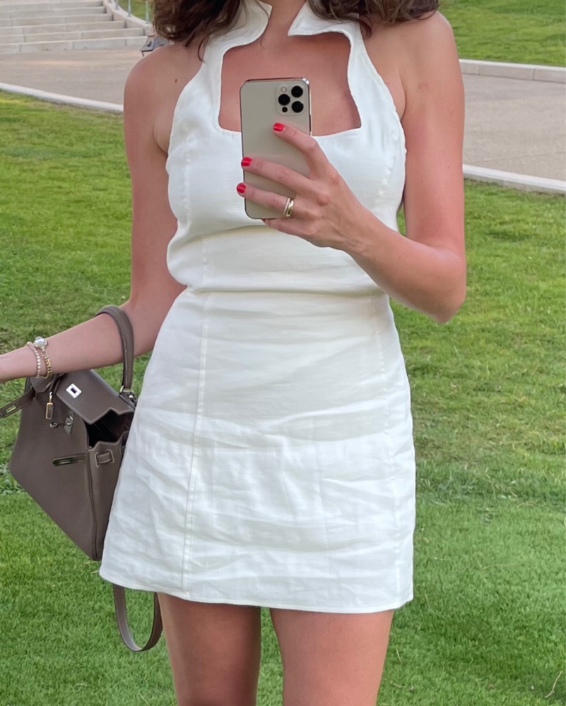 mini dress like 2025 Carey, but Akaia is from 2024. Linen with a bit of stretch.