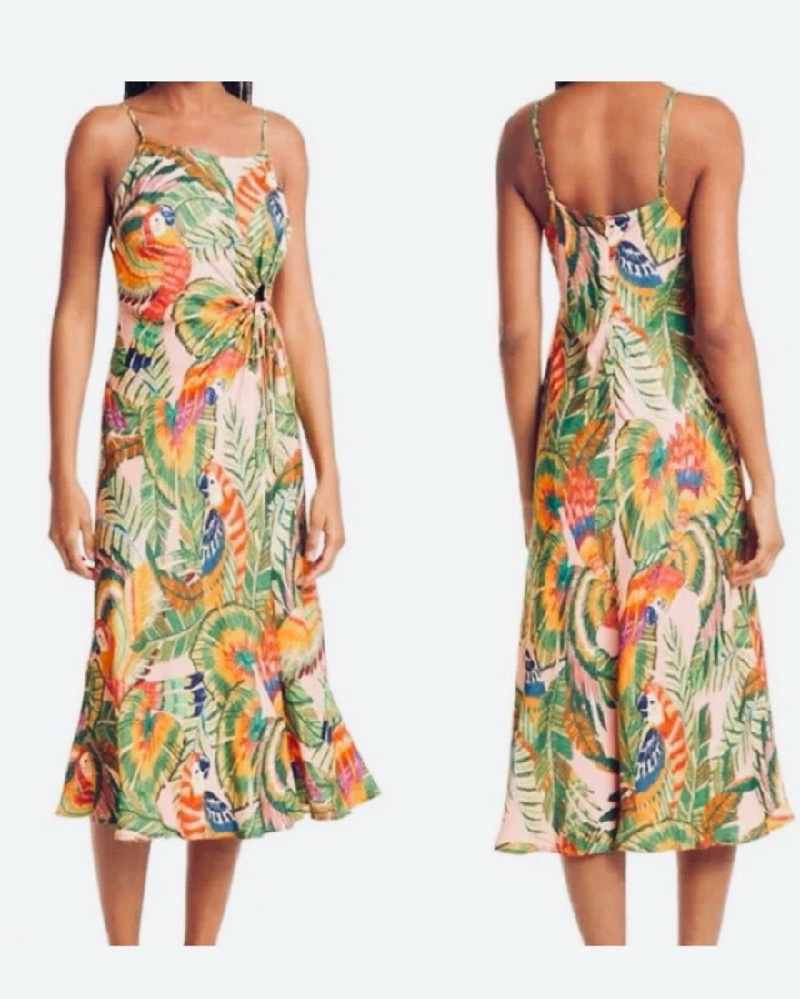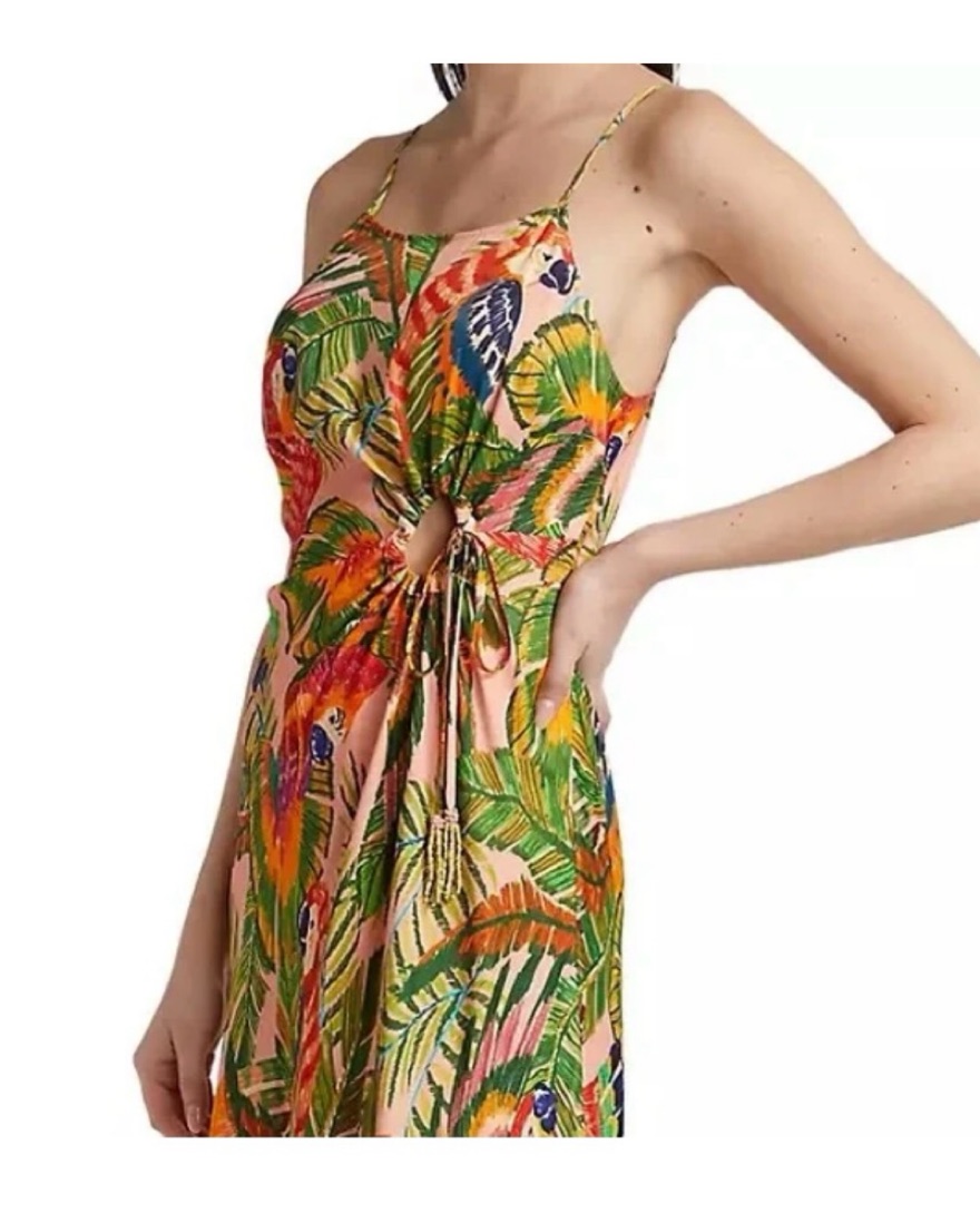 Macaw Leaves Side Knot Dress FARM RIO , beautiful tropical notes of flora and fauna with a side-knot for vacation and sunny activities!