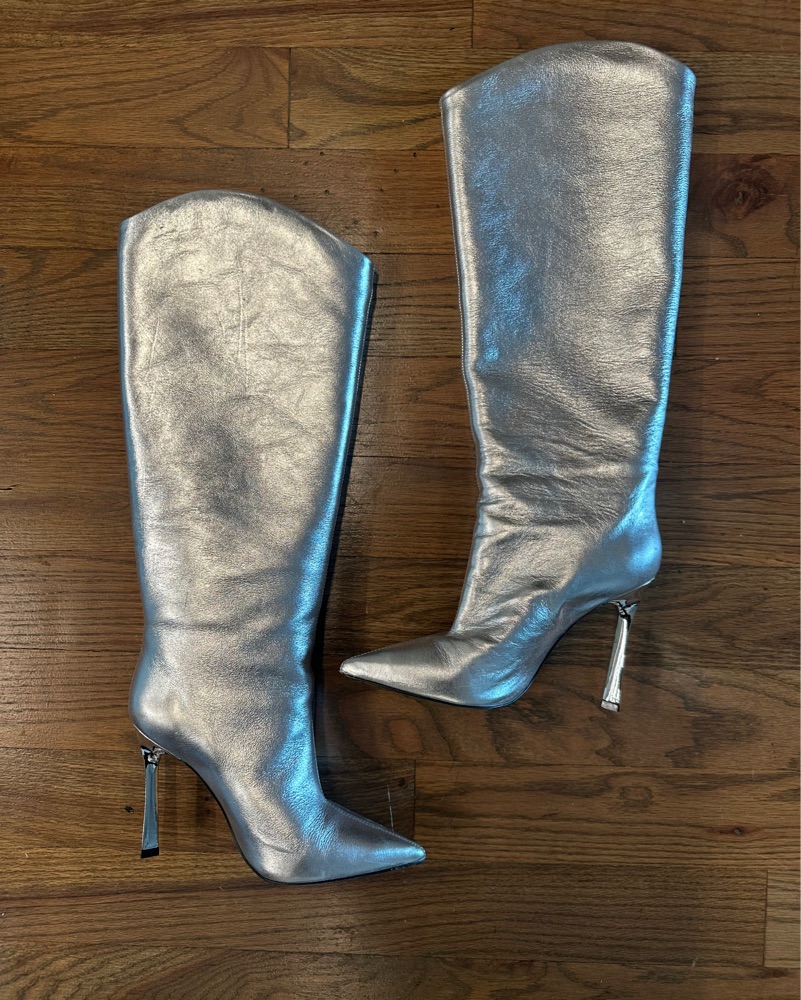 Also Devondra Pointed Silver Boots. It’s the perfect statement boot! Size 8. 4 1/4 inches heel height. Pretty comfortable to walk in.