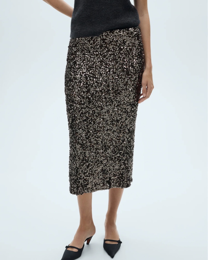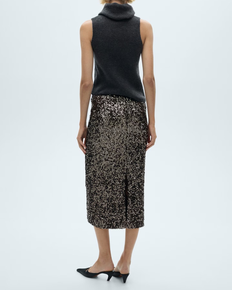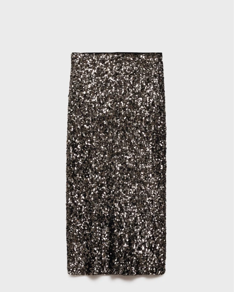 Holiday sparkles with this MANGO sequin midi skirt with hues of black & silver. Perfect for the holidays. Stretchy on the waist. No zipper. Slit in the back which makes it super comfy and not restrictive. Has lining- fabric has zero itchiness!