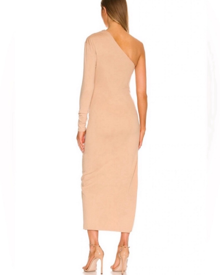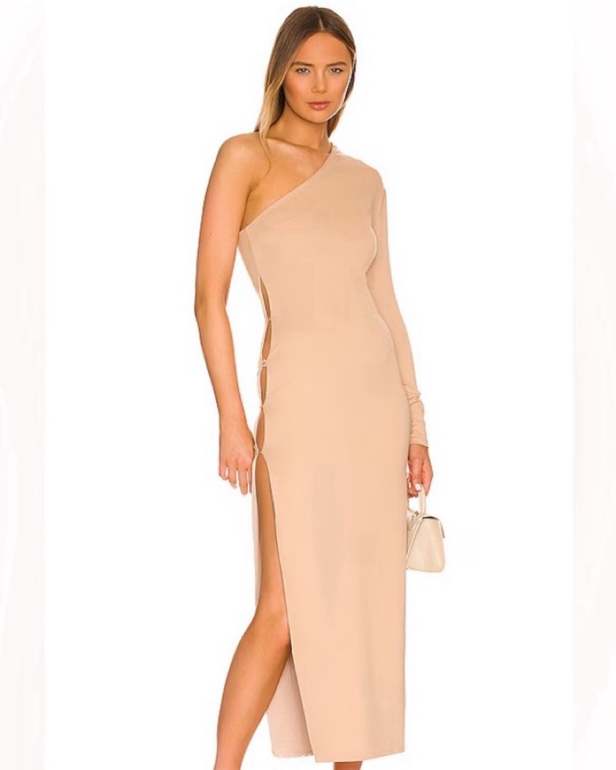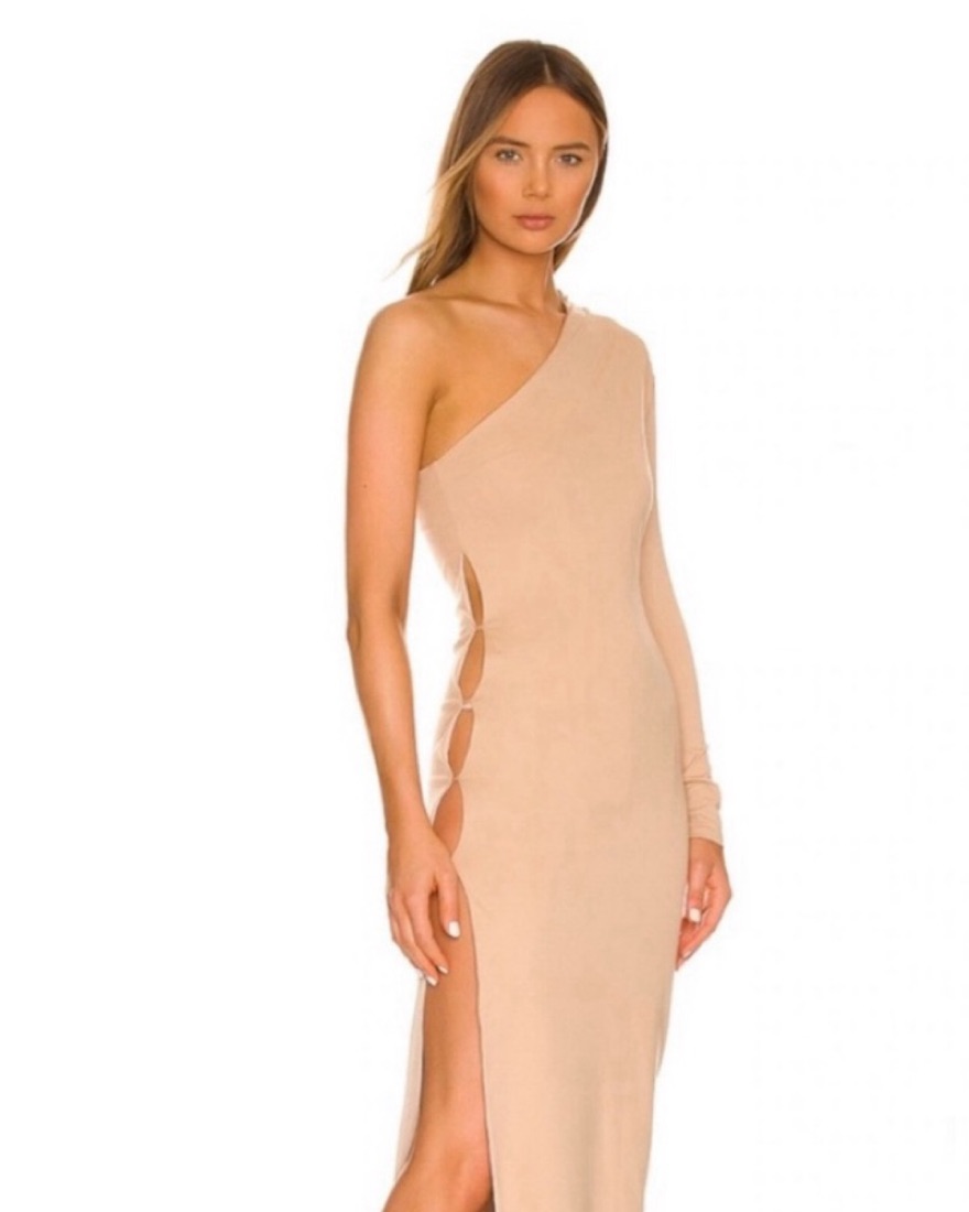Gorgeous Not Yours To Keep nude beige gown with cutouts on one side. It’s classy and elegant with an unexpected daring twist .