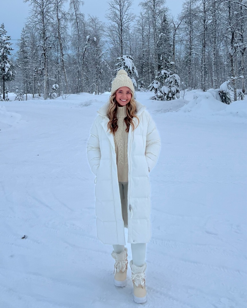Aritzia Crown Puffer Long in Light Birch. I wore this in the Artic Circle in December and was so warm!
