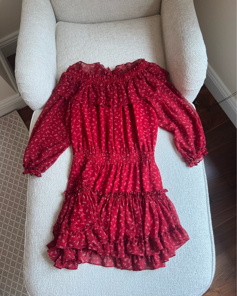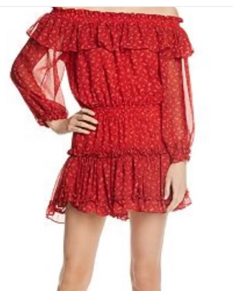 This stylish red floral dress features a ruffled, off-the-shoulder design that effortlessly elevates any occasion.