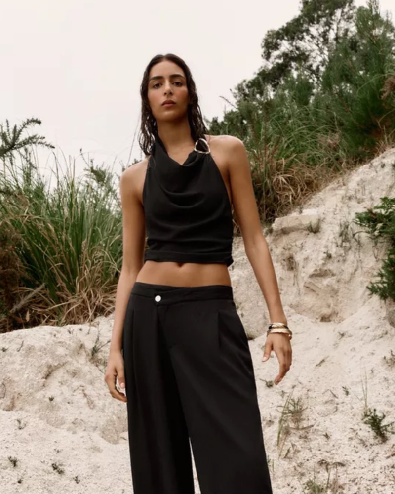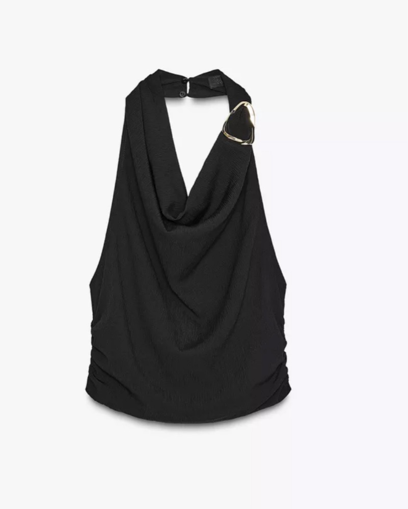 Flowy halter top with front hardware. Open back and side ruching. Back tie closure.