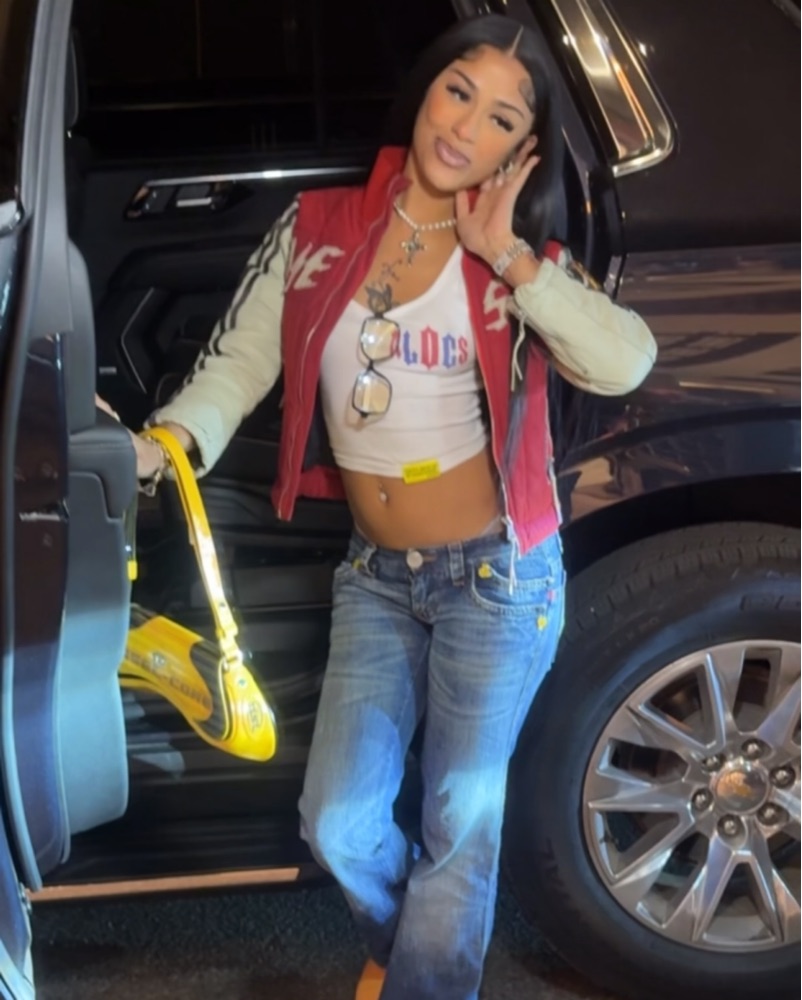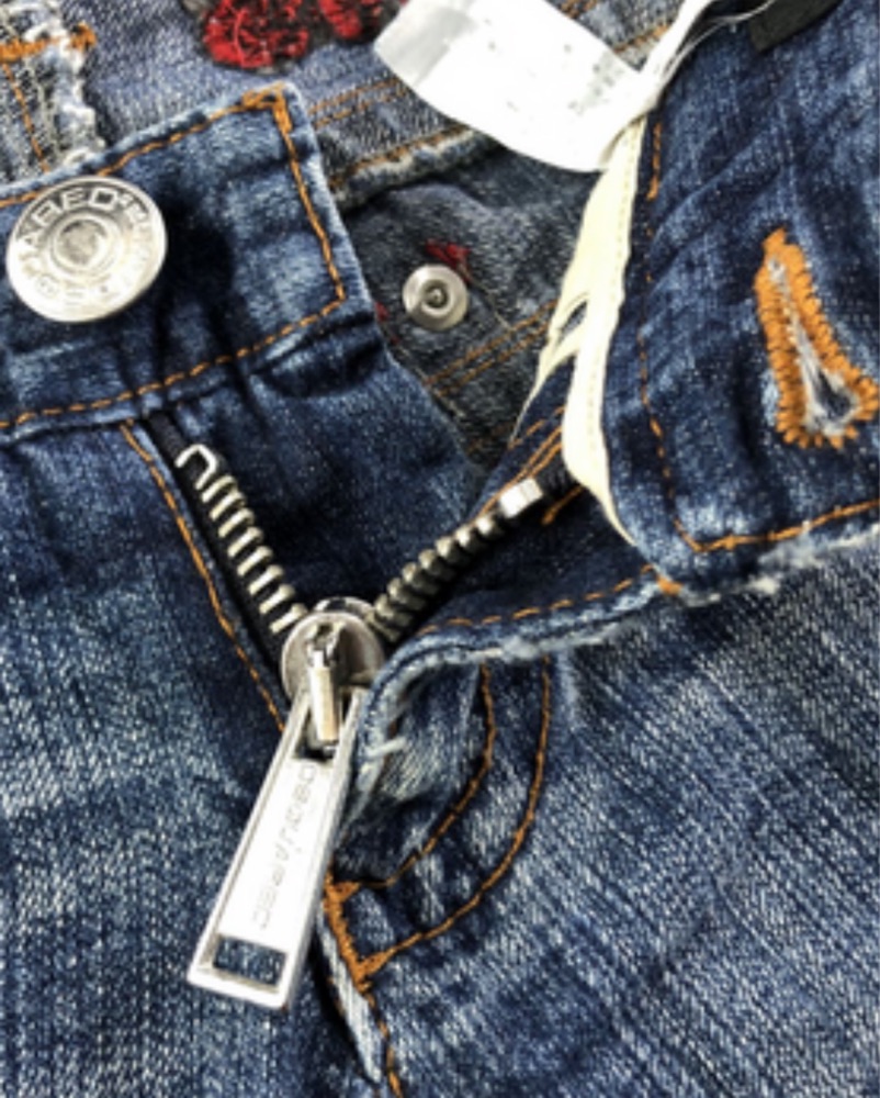 Dsquared2 denim jeans featuring yellow squirrel charms, branded button/zipper and embroidered nature scenery on back pockets. Features red embroidered text that reads Twins Range under belt loops. Waist size 29”. Has random extended belt loop at center of back. Seen on Ahna Mac of Baddies.