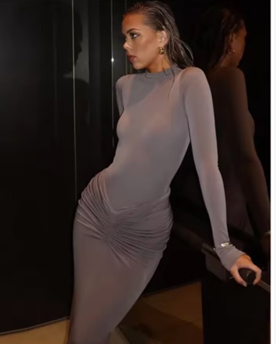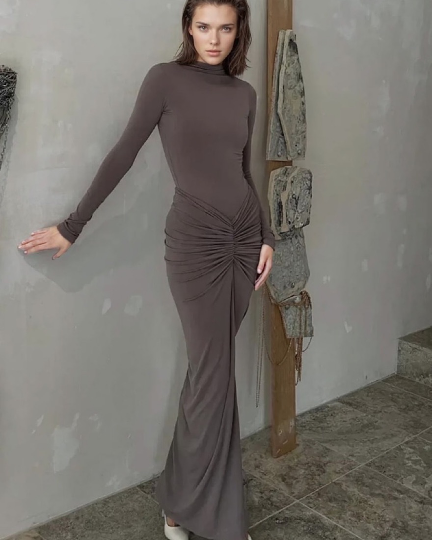 Fits sizes S-M! This stunning maxi dress is perfect for a formal event or special occasion. The ruched detailing creates a flattering silhouette and the long sleeves add a touch of elegance.