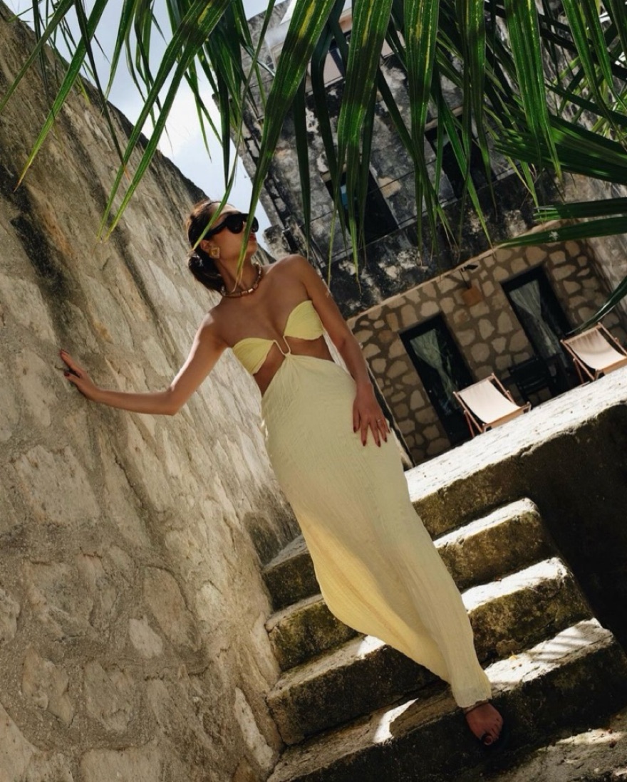 This dress is SO STUNNING. The material is nice too because no need to worry about steaming because it naturally has a textured look. The top is more small chest friendly, id say anything over a C you may feel uncomfy. I strongly recomment fashion tape as well because it will slip if not. The BEST vacation dress. Definitely renting again in the future :) Also, the owner was super nice as well and very quick response.