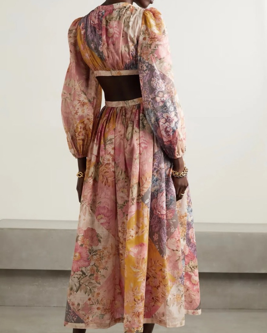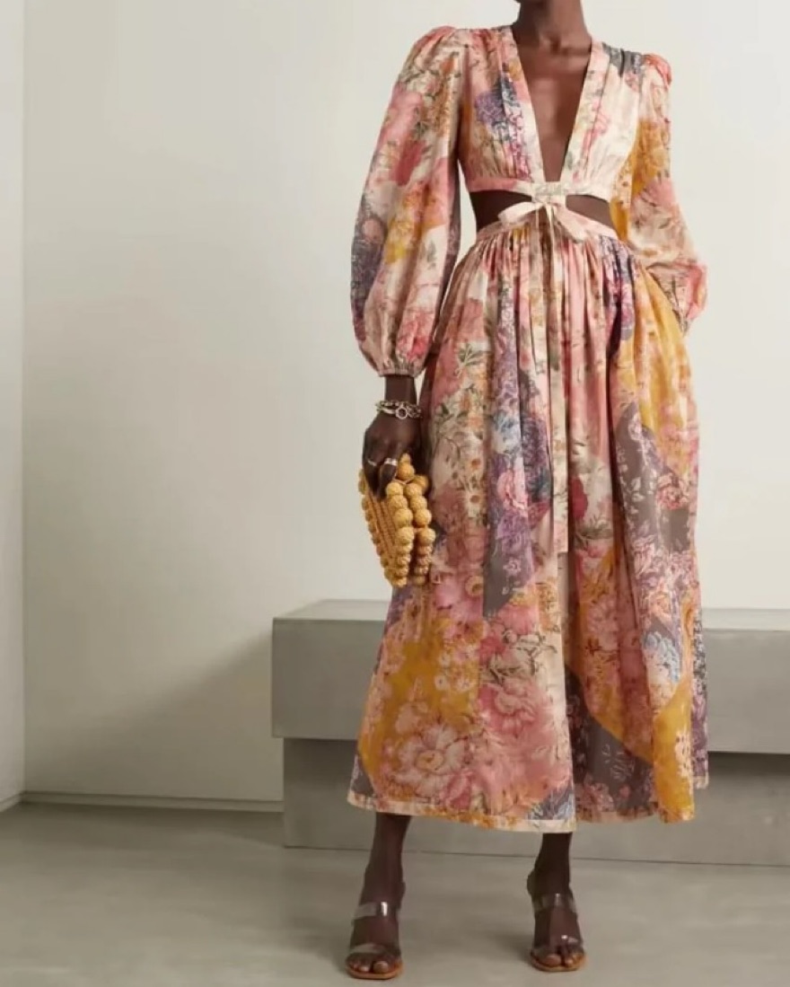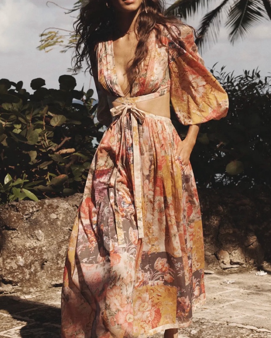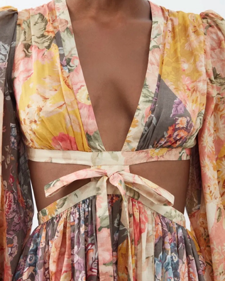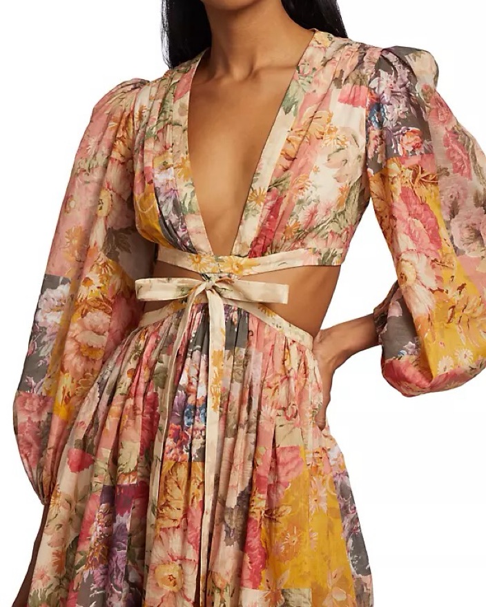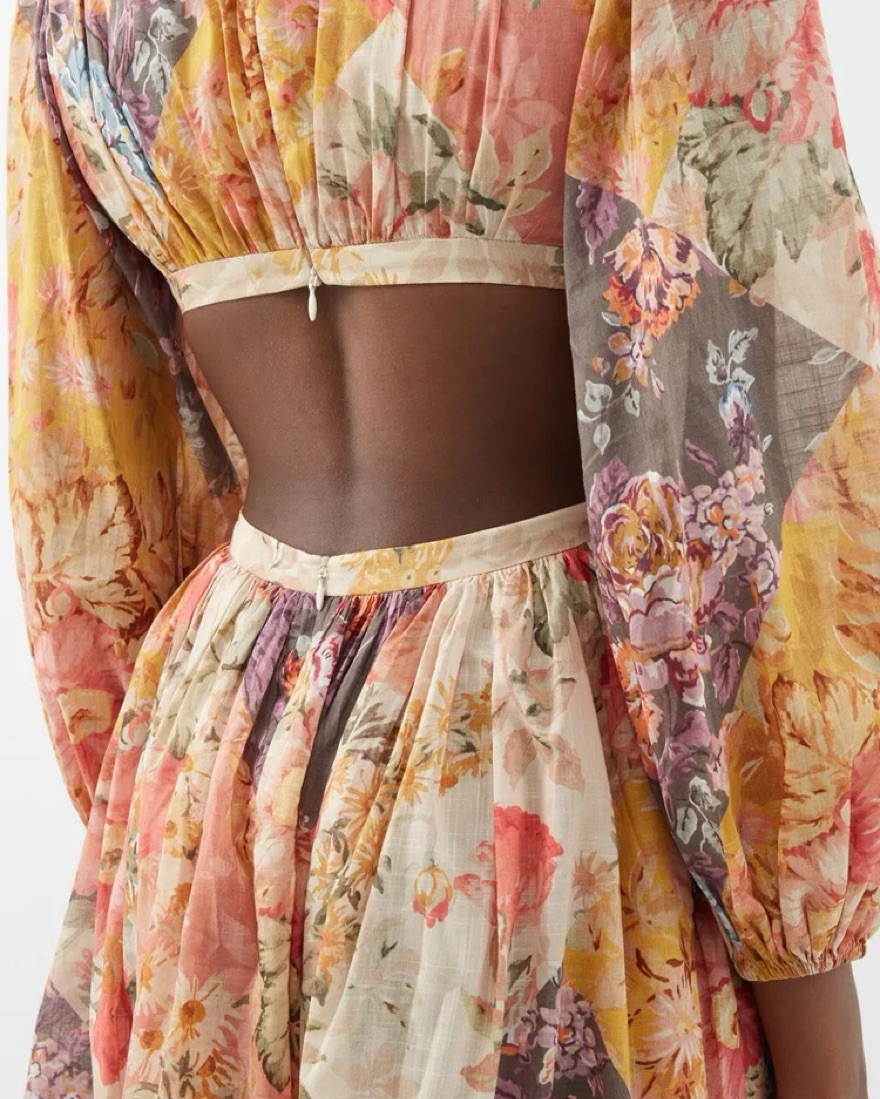 Size AU 0/US 2-4. Fits true to size. Lightweight 100% cotton. Bow can be tied in the front or back. Fitted bust, relaxed through skirt. Plunging V-neck. Puff sleeves. Long sleeves. Banded cuffs. Back zip closure. Self-tie at waist. About 52'' from shoulder to hem. Dry clean only.