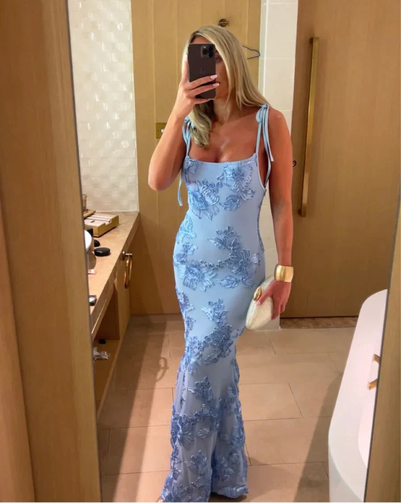 This elegant blue floral mermaid gown is perfect for a formal event or special occasion. The delicate floral pattern and fitted silhouette create a stunning, feminine look.