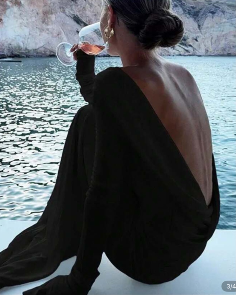 This chic black gown with a dramatic open back is perfect for a formal event or special occasion. The flowing silhouette and sultry design make it a stunning choice.