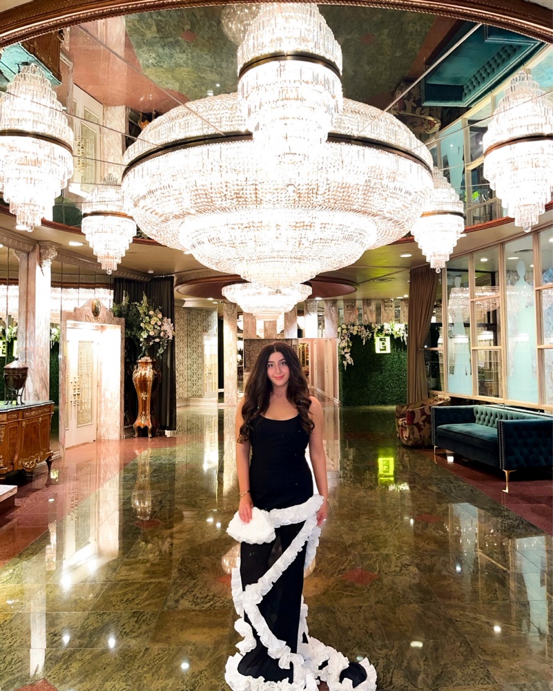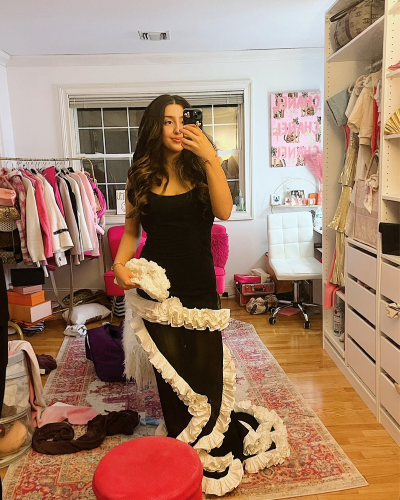 Size medium black and white wisteria gown from revolve NBD. White ruffles. Perfect for a holiday party or black tie wedding. Can rent out with matching clutch for additional cost. Only worn once. End of Train has some discoloration (train is long so it’s not noticeable)