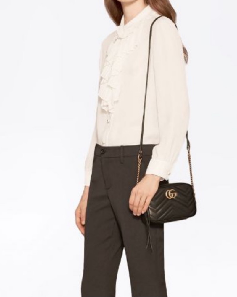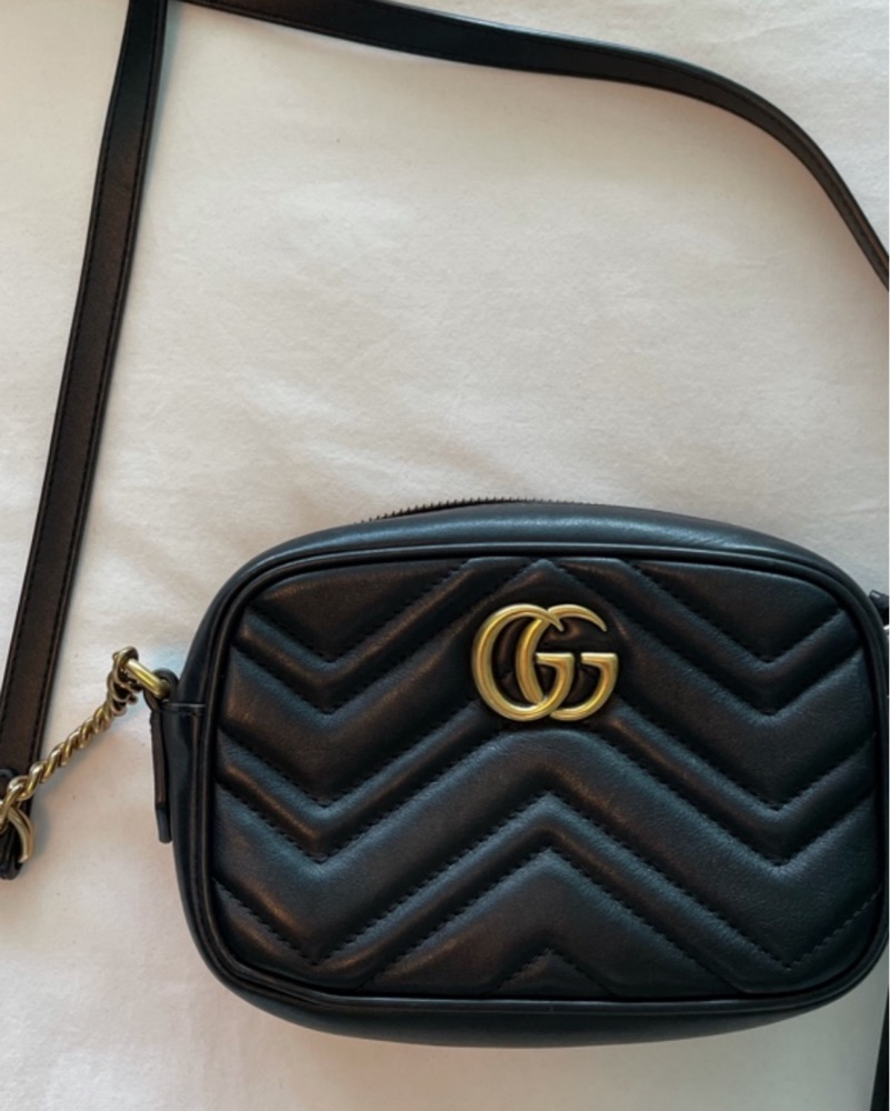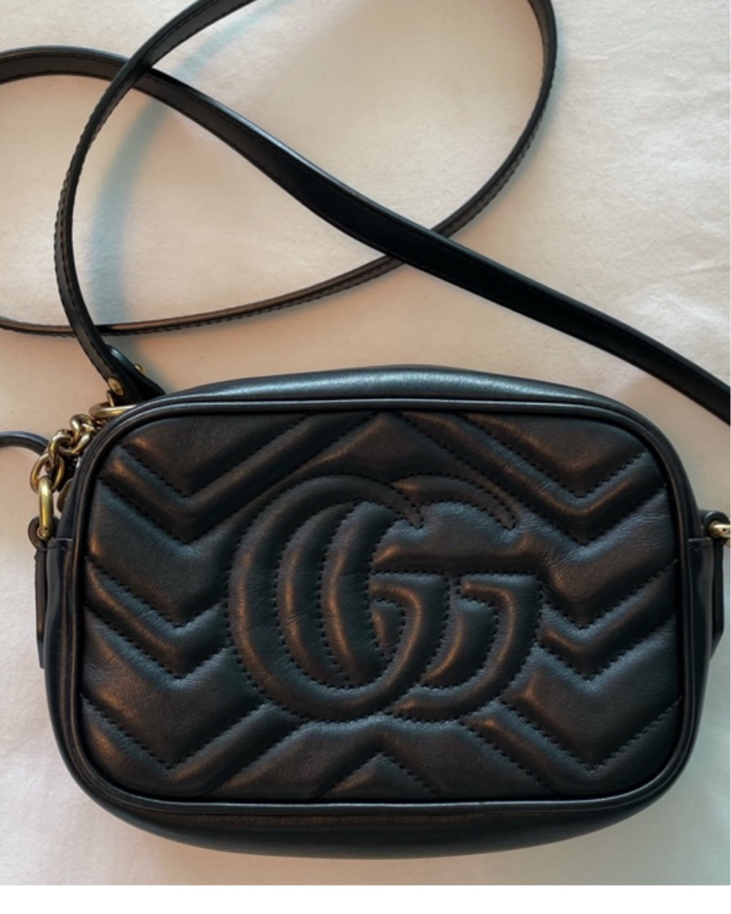 This chic and versatile crossbody bag is perfect for everyday wear or a night out. The quilted chevron design and iconic Gucci logo add an elegant touch.