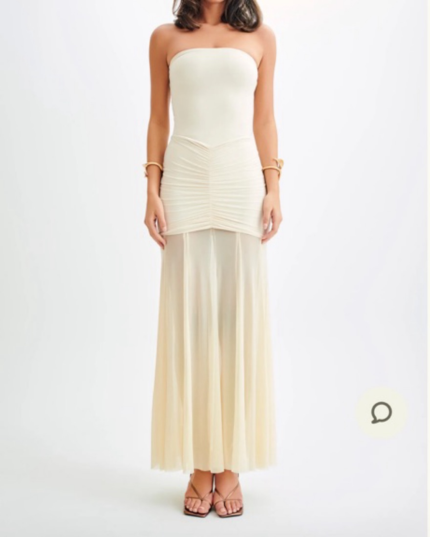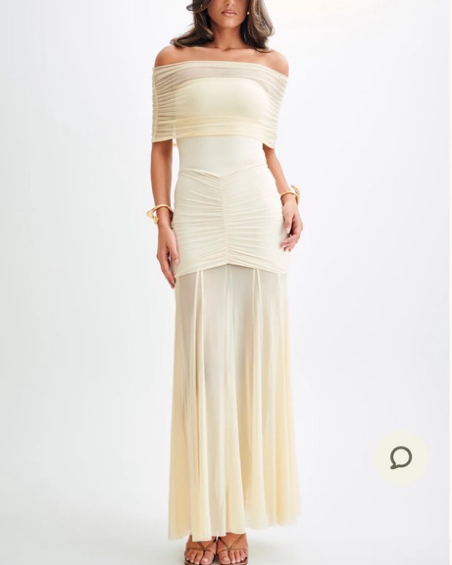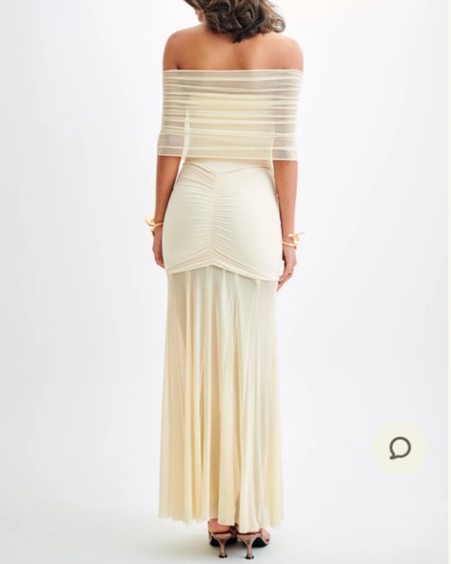 Slinky And Mesh Off Shoulder Maxi Dress - Ivory. Would be perf for a night out or bachelorette party.