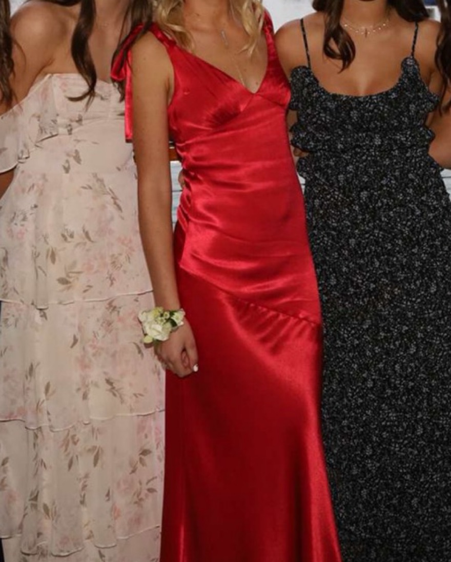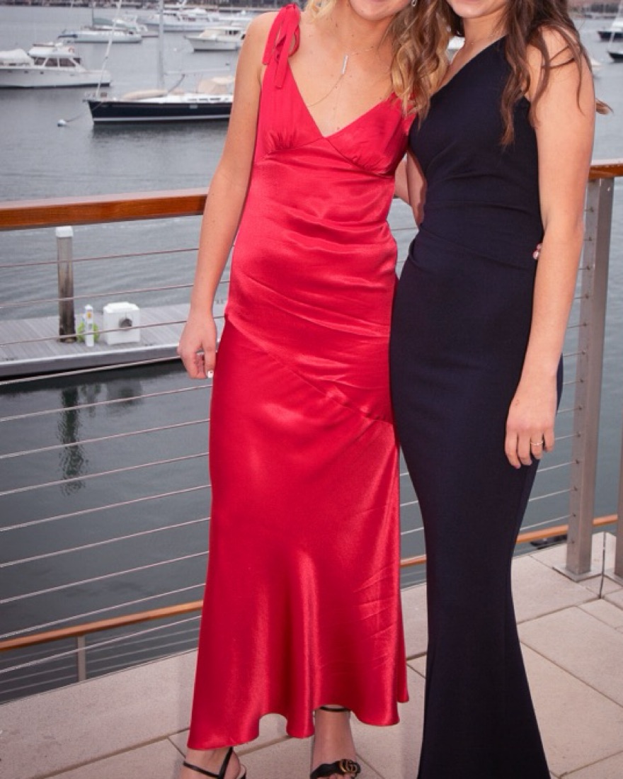 Tie straps, v-neck. Lined, not sheer. This is a lightweight silk charmeuse fabric made from 100% Silk. Dry clean only