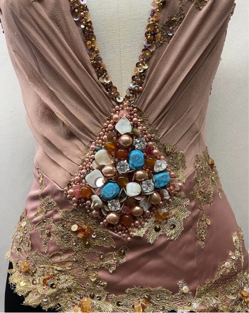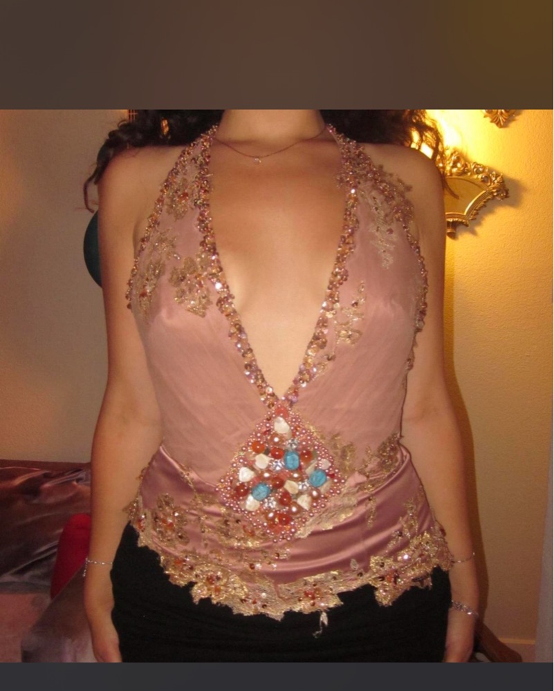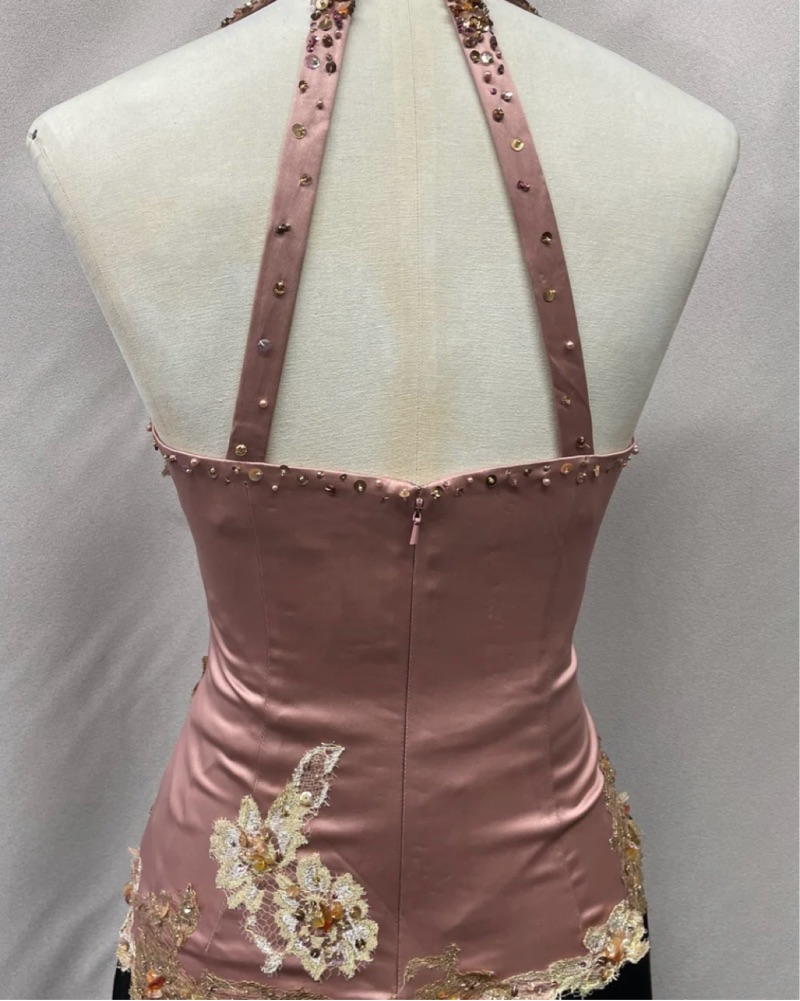 Rare and stunning vintage Mandalay halter corset top in a romantic blush pink satin. It is hand-sewn and extremely delicate. Please handle with the utmost care. Damage to beading or embellishments will result in full repair or replacement charges. Size 6 but has been altered to fit size 2