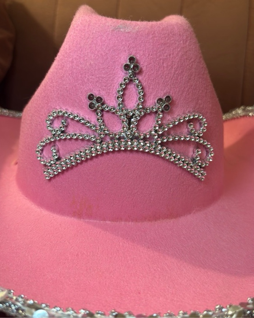 This pink cowboy hat features a sparkling silver trim and a decorative crown design. Perfect for dress-up or themed parties. It has some wear and tear as shown in the pictures, but if you’re wearing it out you can’t tell. It also lights up!