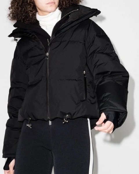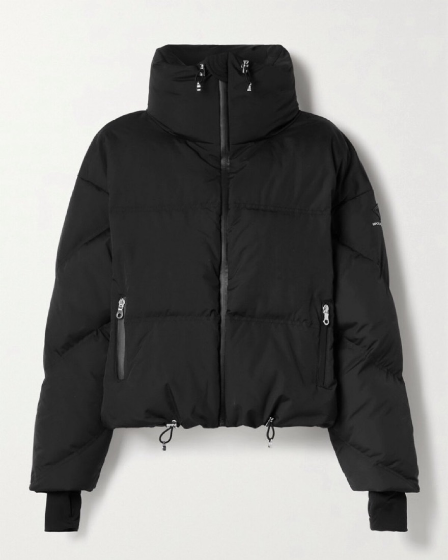 Black Cordova softshell ski jacket made of recycled materials. Features include a snow skirt, thumb loops, drawstrings at neckline and waist, two zippered pockets on either side, an interior pocket and backpack straps.