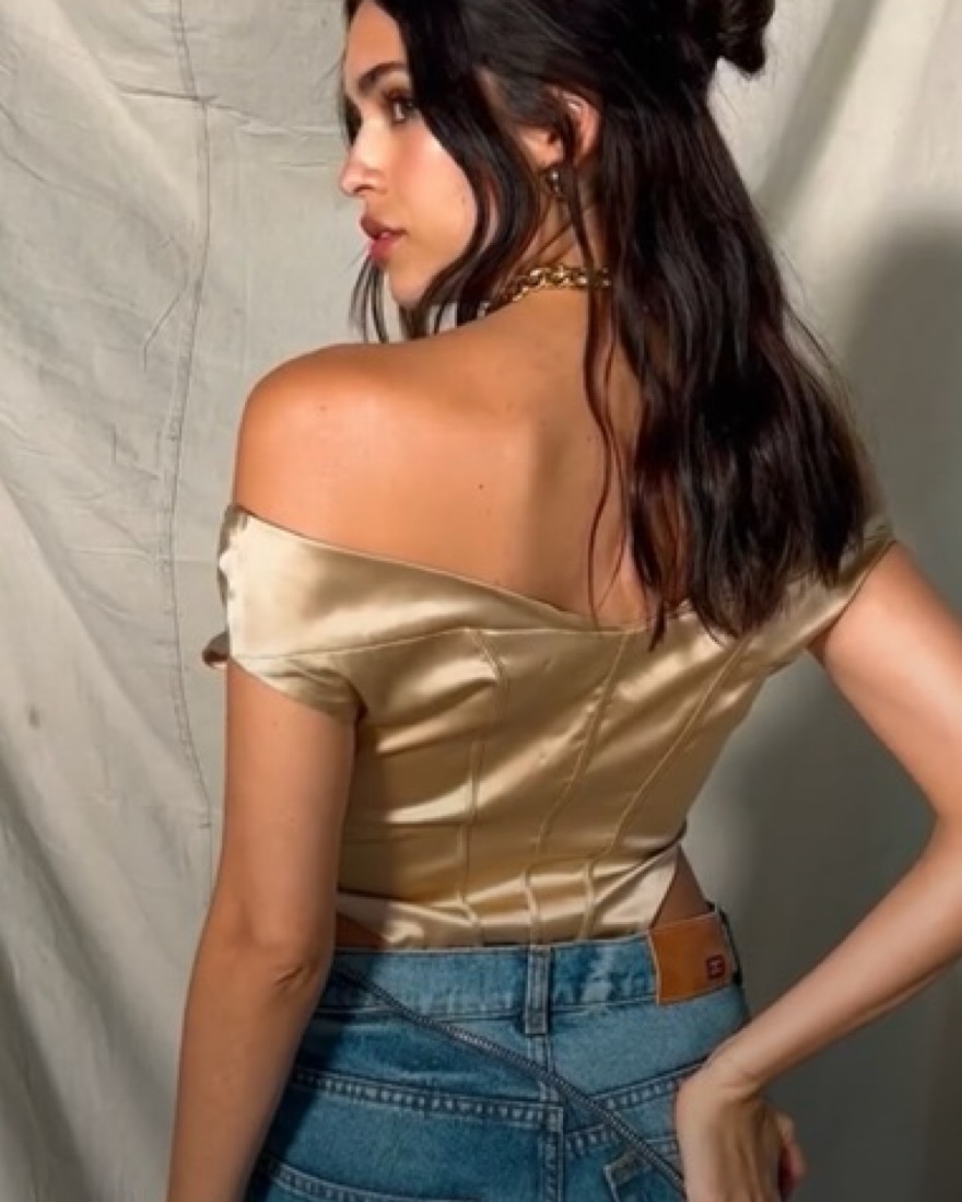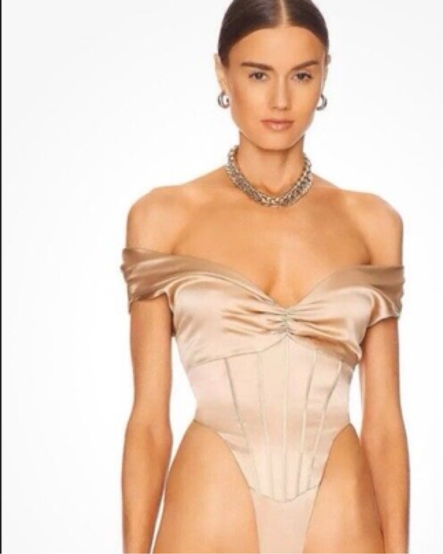 The corset bodice features off-the-shoulder straps and a gathered bust with boning that then cascades into exaggerated high cutouts at the hip