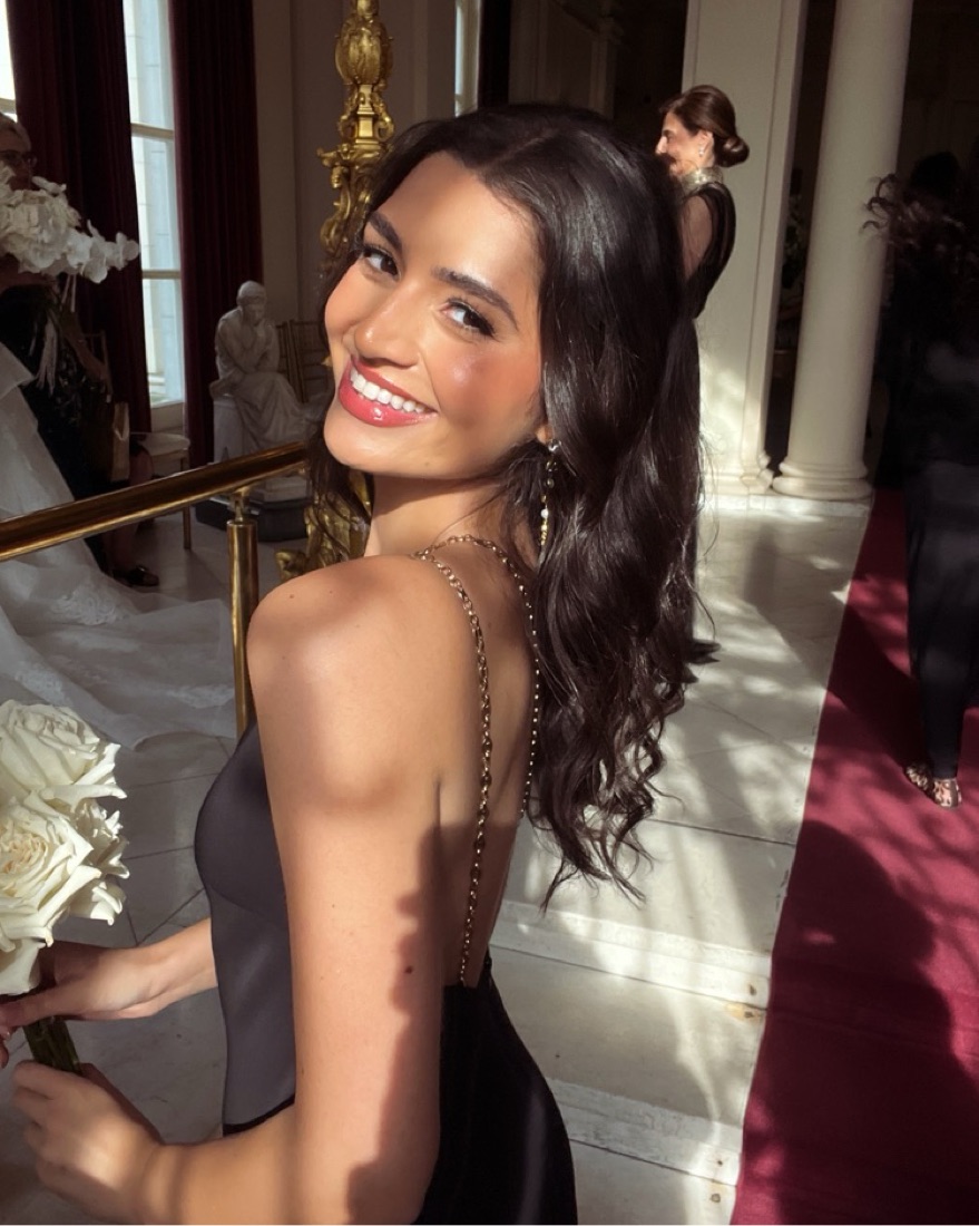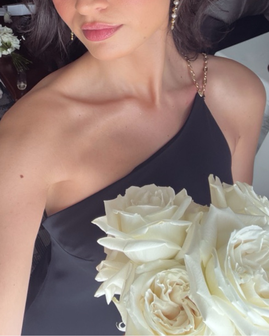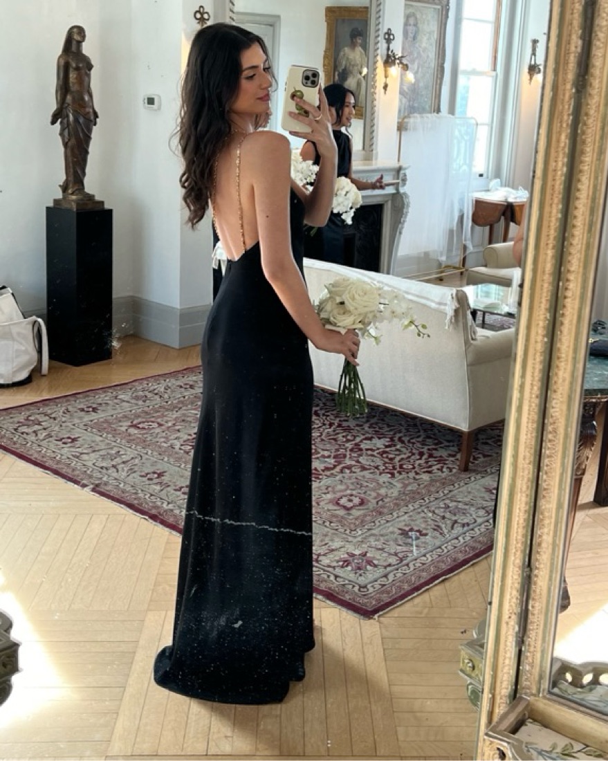 This stunning backless gown is perfect for a black tie event or other special occasion. The sleek silhouette pairs perfectly with the gold chain straps. For reference I am 5’11 and typically wear somewhere between a 6-10 depending on the brand. Must dry clean prior to return