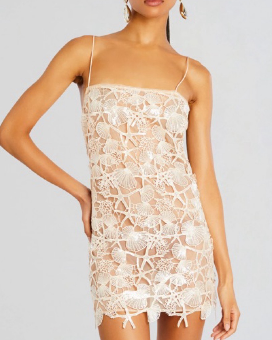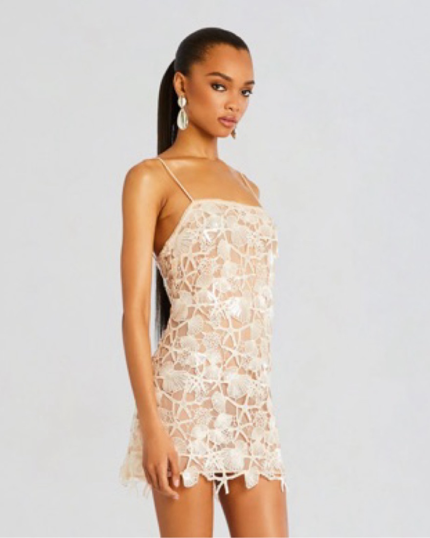 • Delicate lace with shimmering sequins. The • Spaghetti straps, short hemline • Size Small in Cream. • 100% Polyester • Model is 5'10" wearing size S
