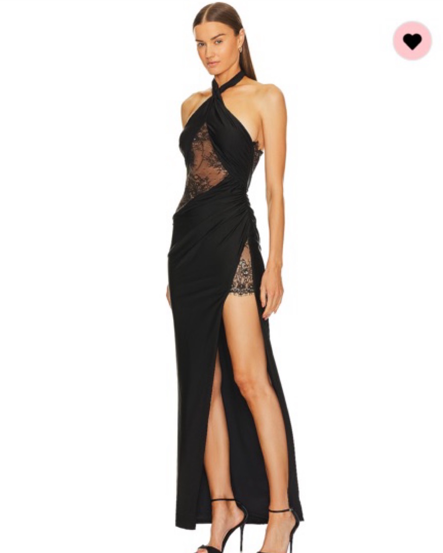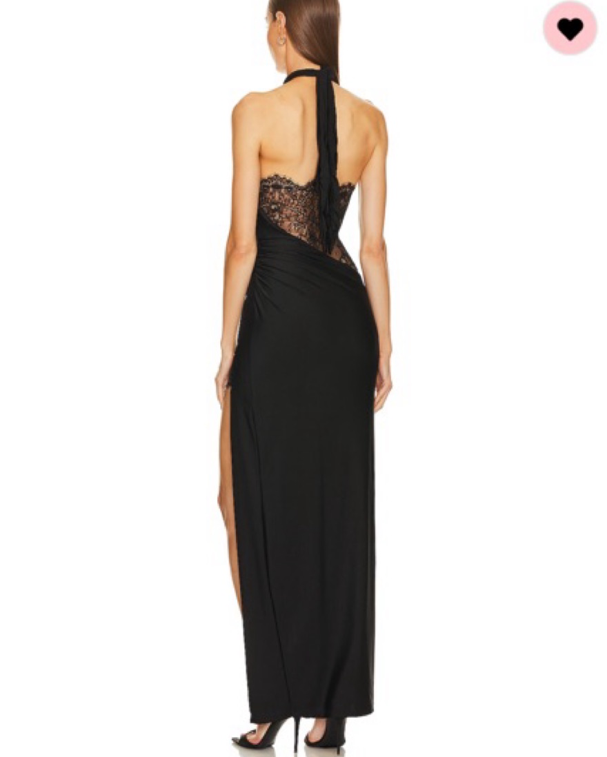 Black Halter neck gown with see through lace details throughout torso and at side slit!