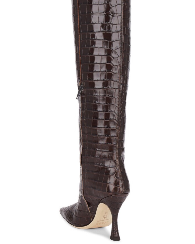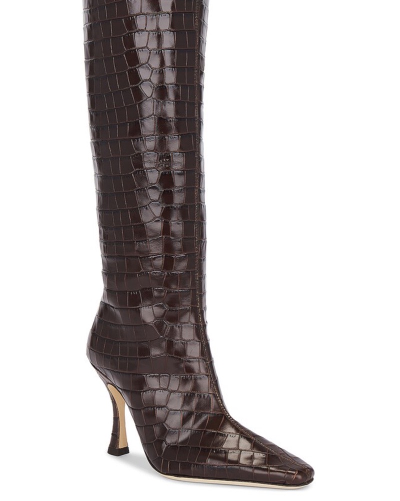 Burgundy brown crocodile embossed leather Staud boots, size 8.5 US but fit 7.5-8.5 too (I wear 7.5). Easy to walk in. Heel is approx. 3.5 inches but feels more like 3 inches given that it’s a boot.