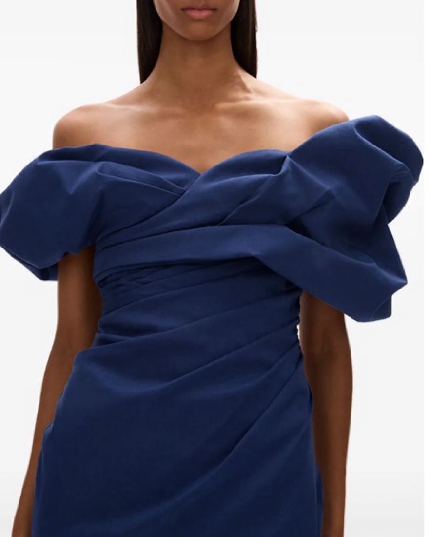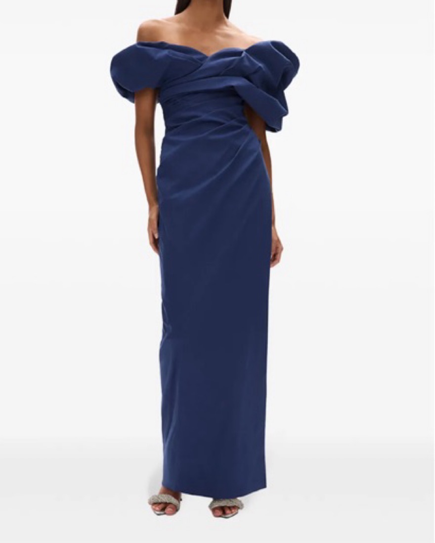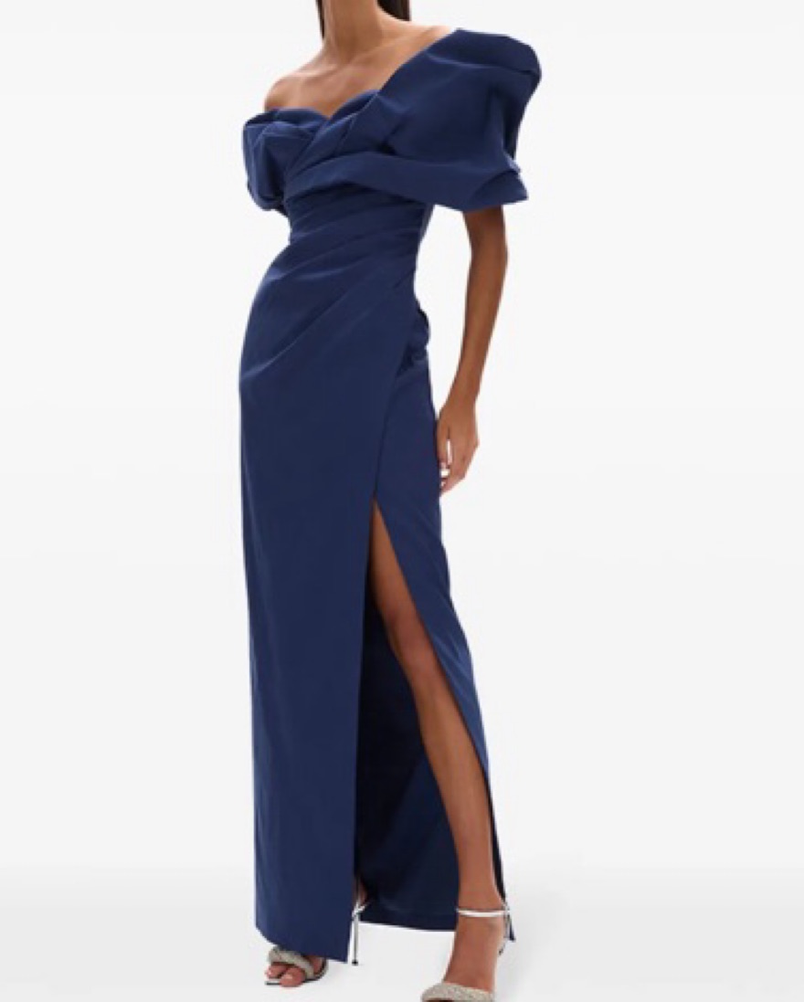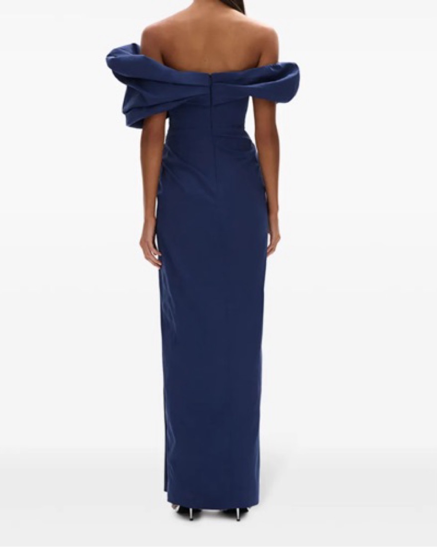 navy blue stretch-design ruched detailing side slit off-shoulder rear zip fastening straight hem long length