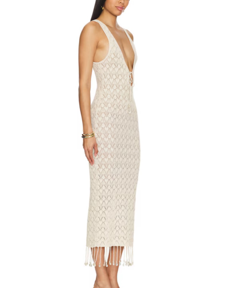 Abeni Keyhole Midi Knit Dress in Nude Camila Coelho Self: 47% viscose, 38% cotton, 15% linen Made in China Dry clean only Unlined Front tie closure