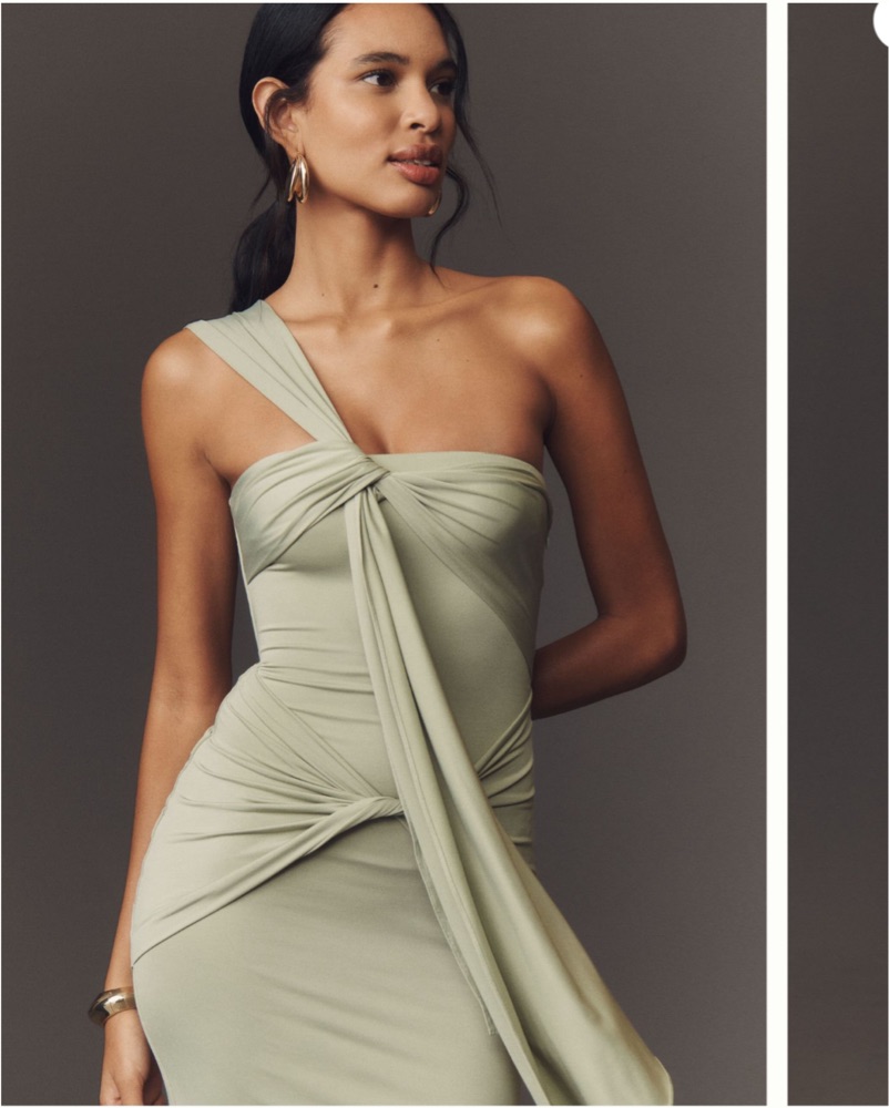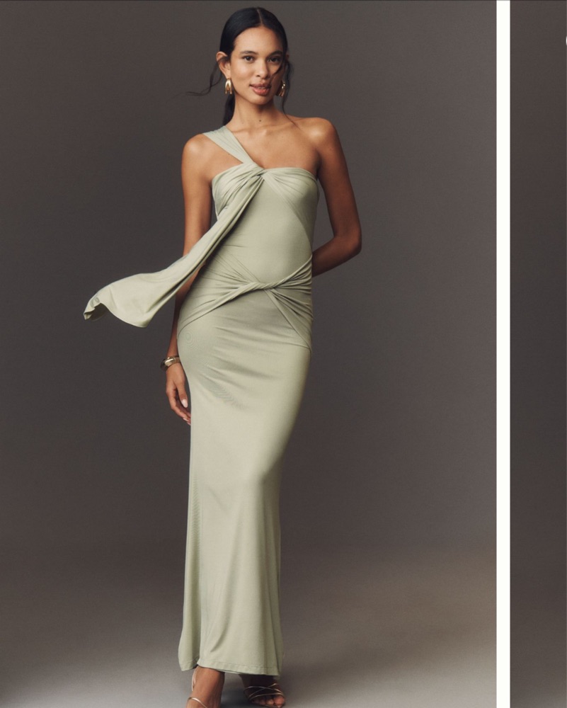 Studio Lexi sage green floor length dress with one shoulder neckline, draped detailing, side zipper