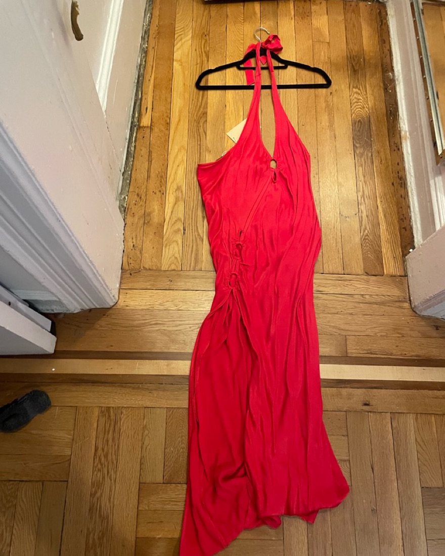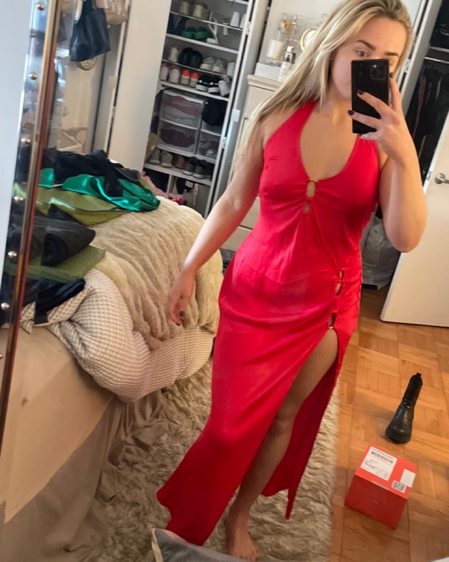 Super cute res maxi dress with a leg slit and o-ring details on bust and hip. Sizes 4-6