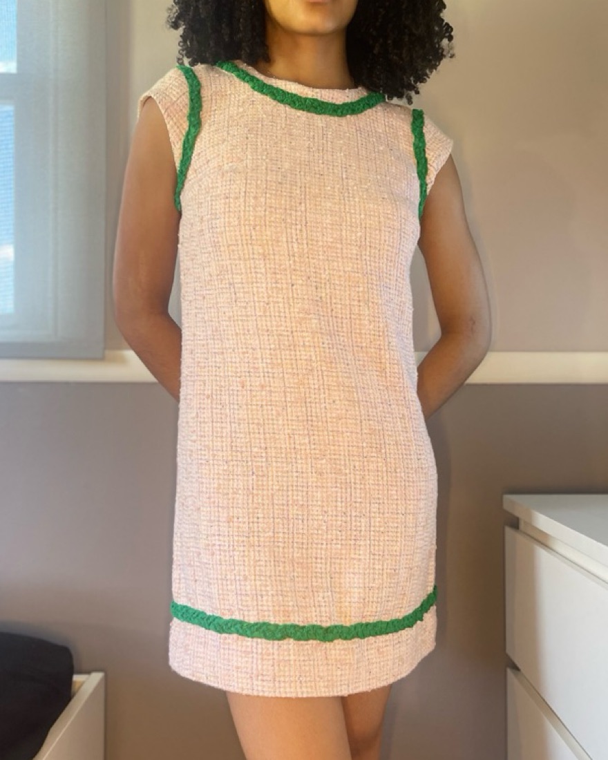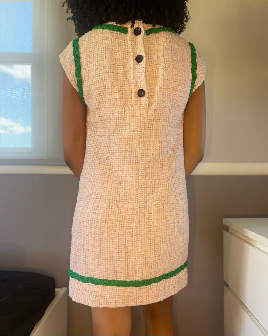 pink tweed with green braided detail. button up back. great for work and conferences!