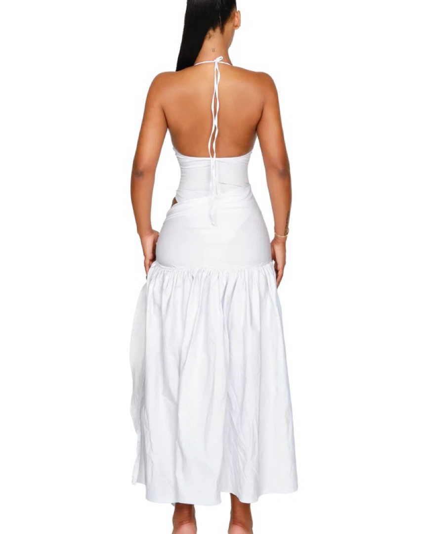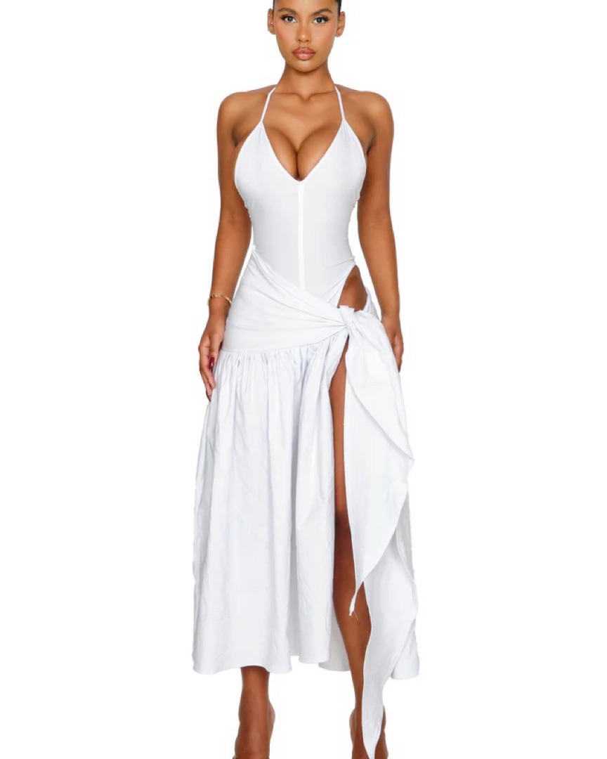 Illusion midi dress in Crushed Ice. Halter plunge bodysuit with conjoined skirt piece, crafted in thick, crisp textile. Tie at the side to reveal as much as you want.