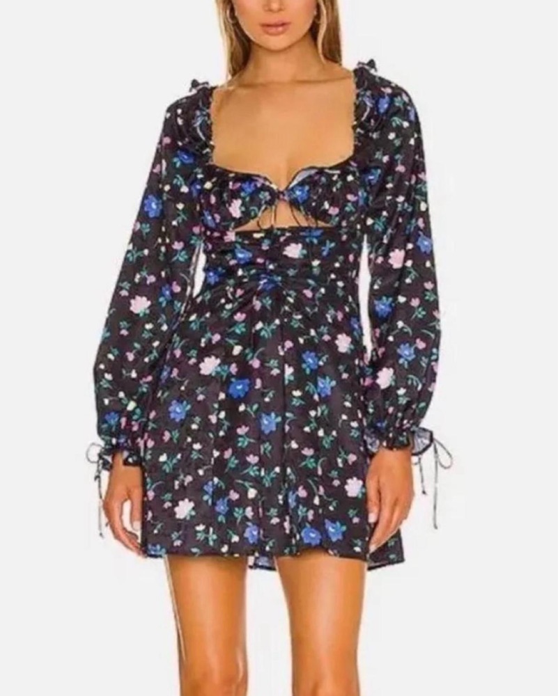 Cute black floral mini dress. Has long sleeves with tie details on cuffs. Square neckline and a fun cut out detail on the front. Drawstring ruching on the bodice. Super comfy and stylish.