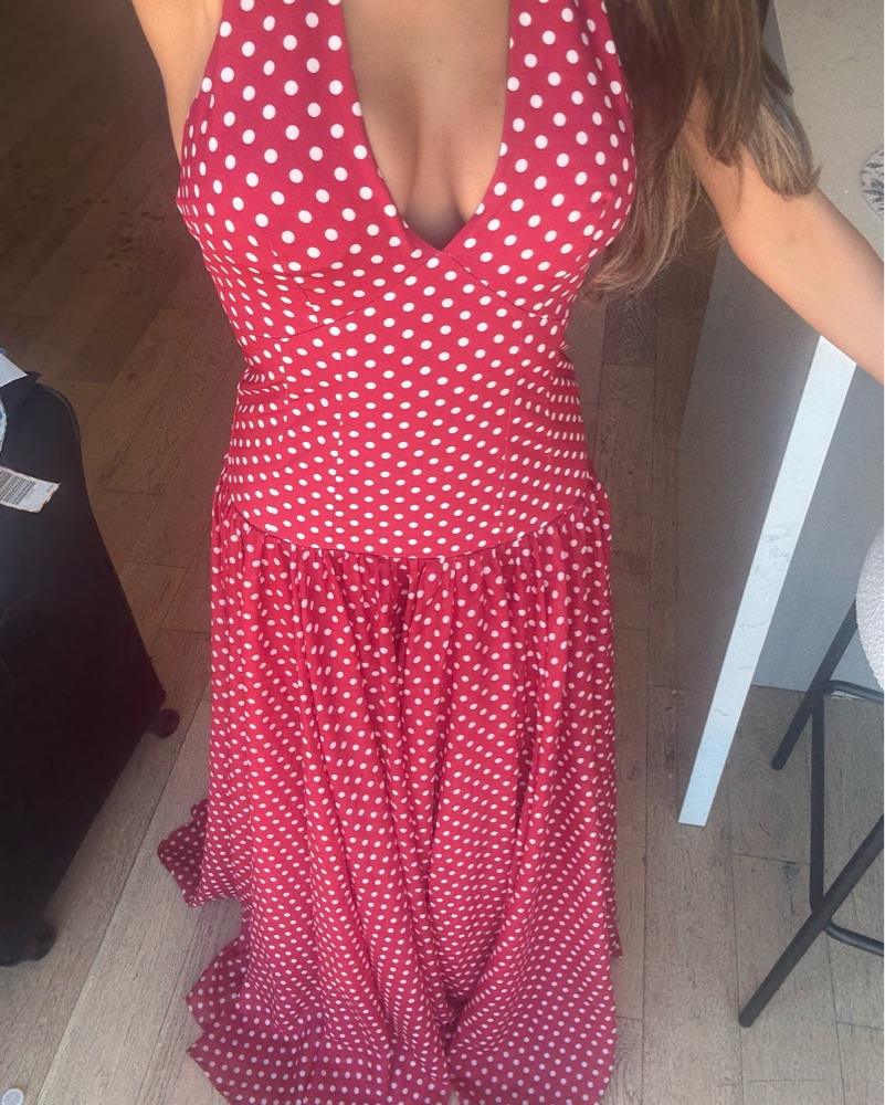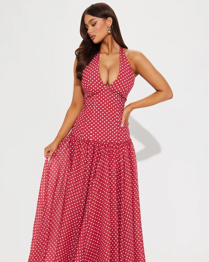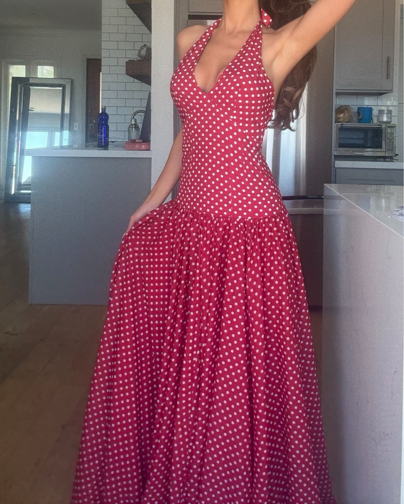 This stunning polka dot maxi dress is perfect for a summer evening out or a beach getaway. The bold red and white pattern creates a fun and flirty look.